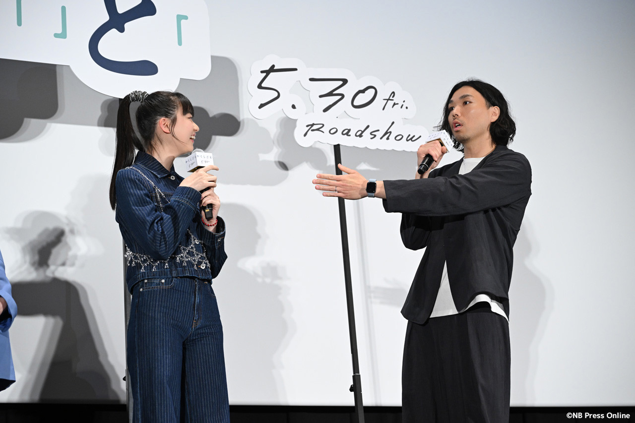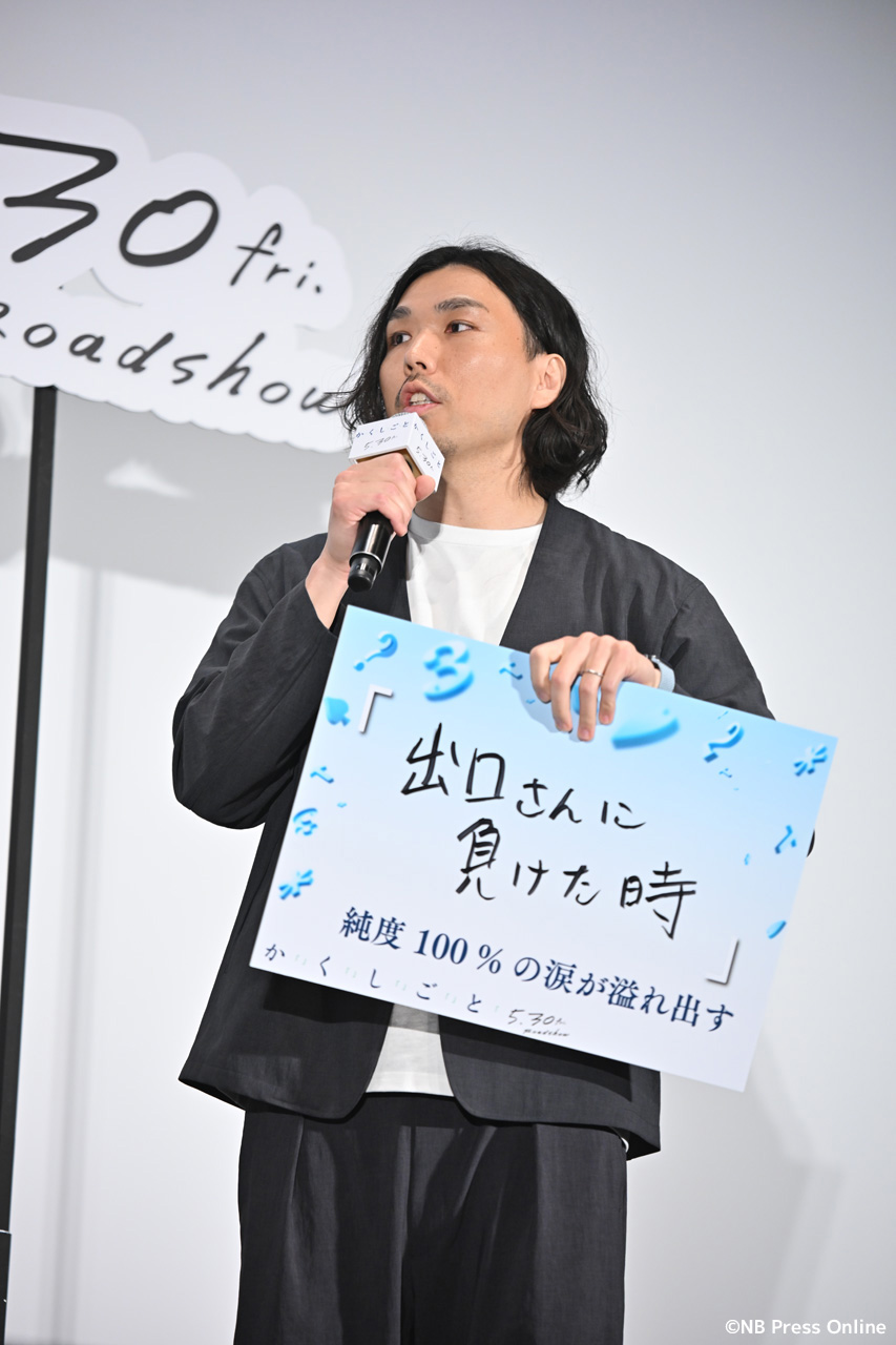 中川監督は「出口さんに負けたとこ」と回答。これに出口が「え、どういこと?なんか勝ちましたっけ?私」と首を傾げると、監督は自身に2歳の娘がいることを明かし、その娘が本作のキャスト、特に「出口さんが一番推し」になったと告白した。娘に「パパと“なちゅき”どっちが好き」と聞いたところ、食い気味で「“なちゅき”!」と返されたエピソードを披露し、「その時に純度100%の涙が溢れ出ました」と語り、会場を沸かせた。