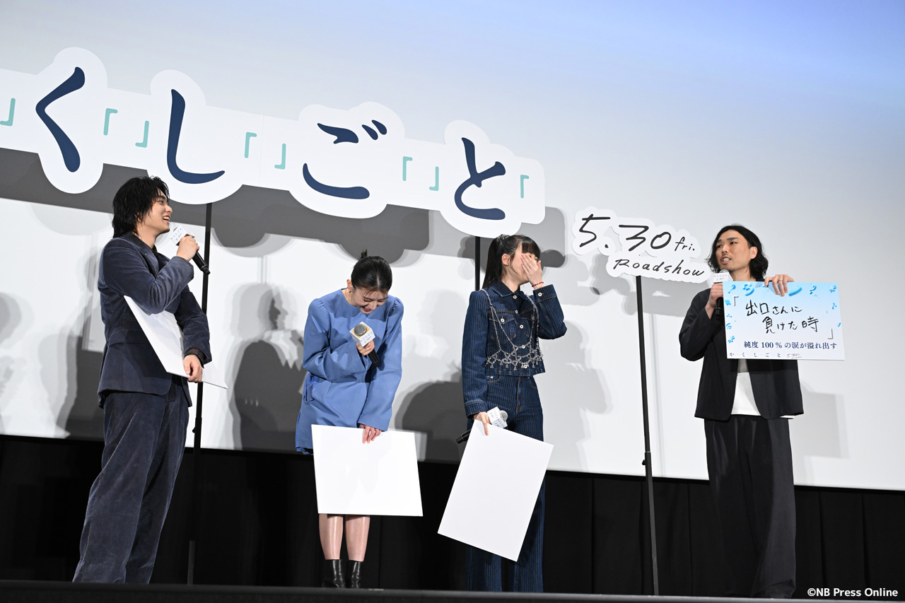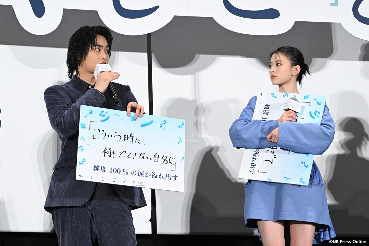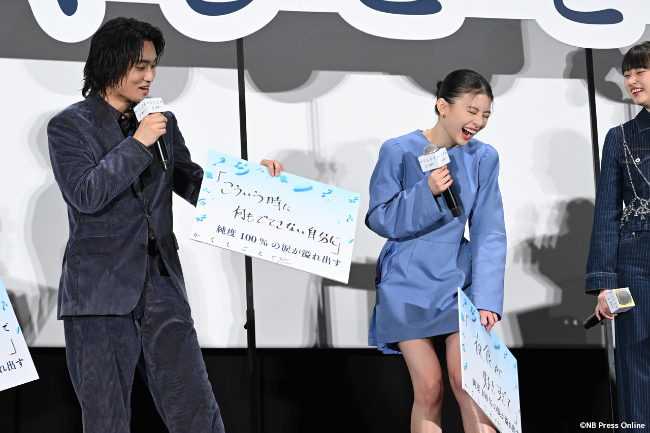 イベント後半では、本作のキャッチコピー「もしも君の気持ちが見えてしまったら純度100%の涙が溢れ出す」にちなみ、登壇者それぞれが「〇〇すぎて、純度100%の涙が溢れ出してしまうもの」をフリップで発表する企画が行われた。