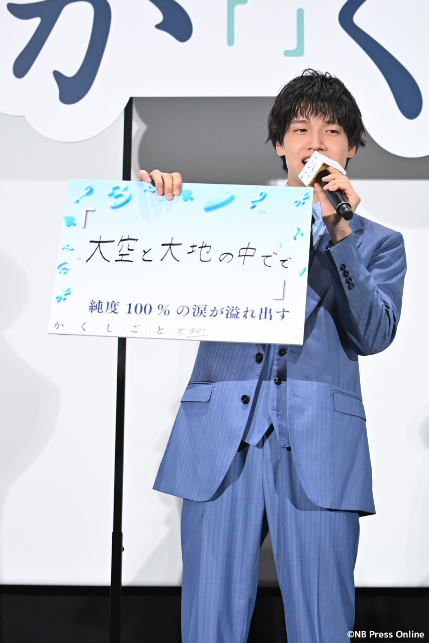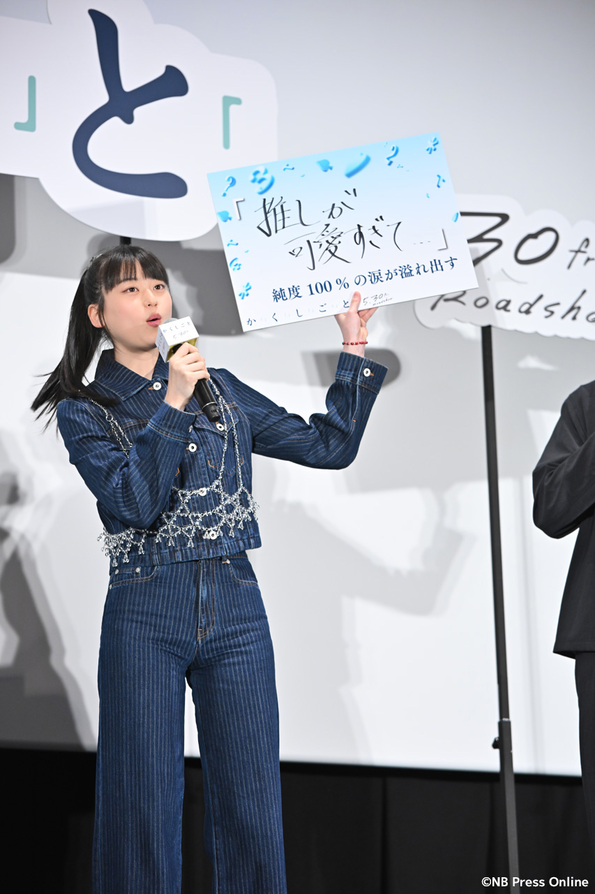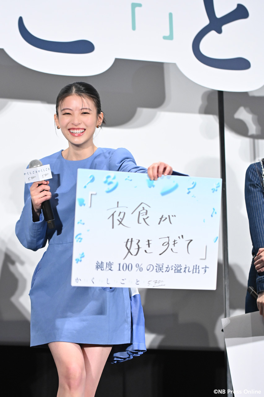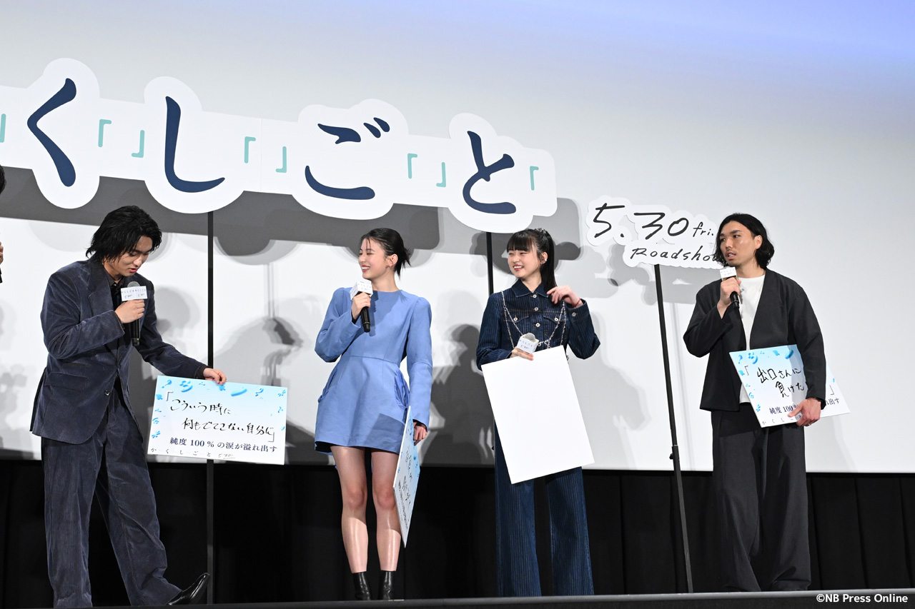 イベント後半では、本作のキャッチコピー「もしも君の気持ちが見えてしまったら純度100%の涙が溢れ出す」にちなみ、登壇者それぞれが「〇〇すぎて、純度100%の涙が溢れ出してしまうもの」をフリップで発表する企画が行われた。