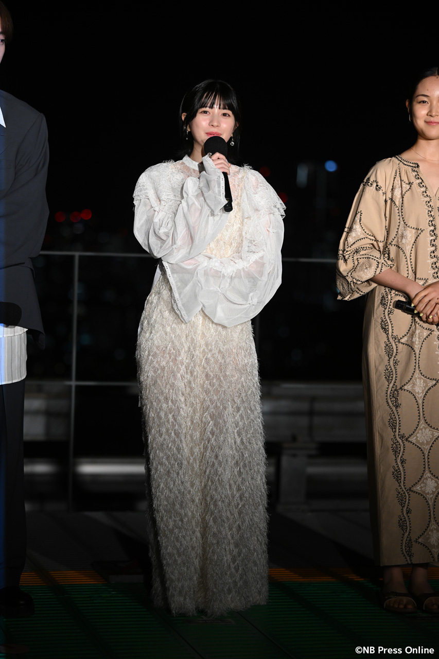 MC・三原氏の開会宣言に続き、登壇者が紹介され、大きな拍手で迎えられた。主人公・溪本亜紗を演じた桜田ひより、亜紗と同級生で同じ天文部に所属する飯塚凛久を演じた水沢林太郎、長崎の五島列島に暮らす佐々野円華を演じた中野有紗、そして山本環監督がヘリポート上のステージに並んだ。