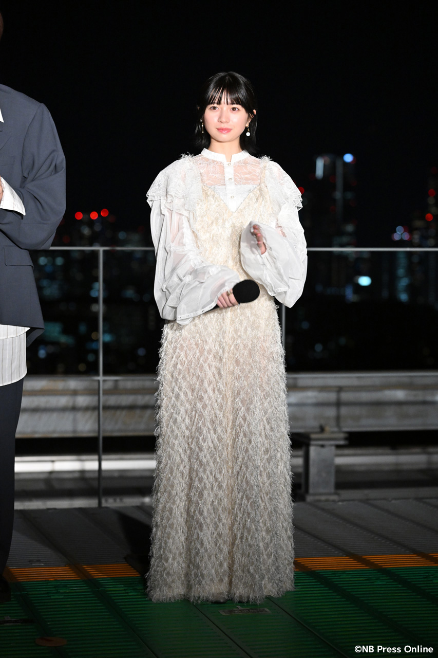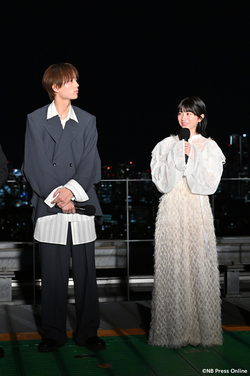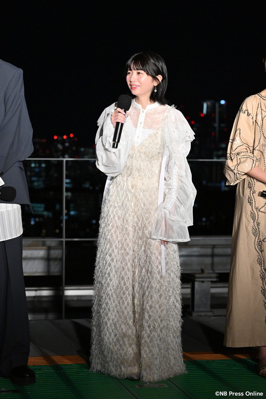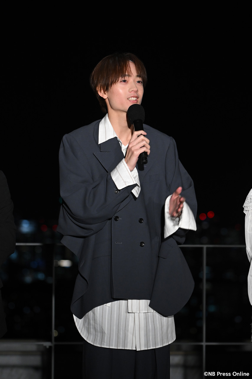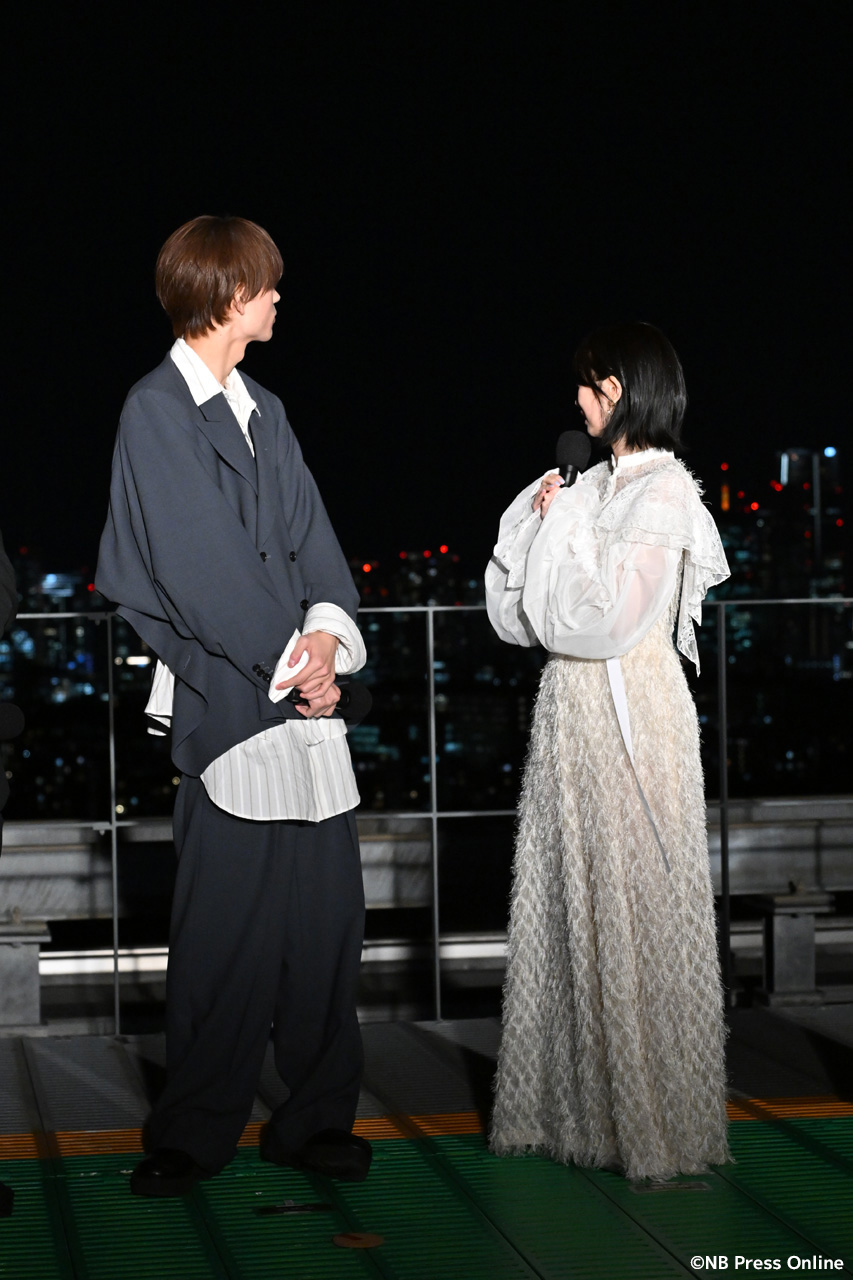司会の三原氏から、早速会場である新宿バルト9の屋上、ヘリポートに立ってみての感想を求められると、桜田は、「ヘリポートに立ったことなんて人生初めてです」と語り、「多分初めての方も多いと思うんですけど、本当にすごくキラキラしていて、雨も降らずに本当に安心しました」と、イベントが無事開催できた安堵と会場への感動を述べた。