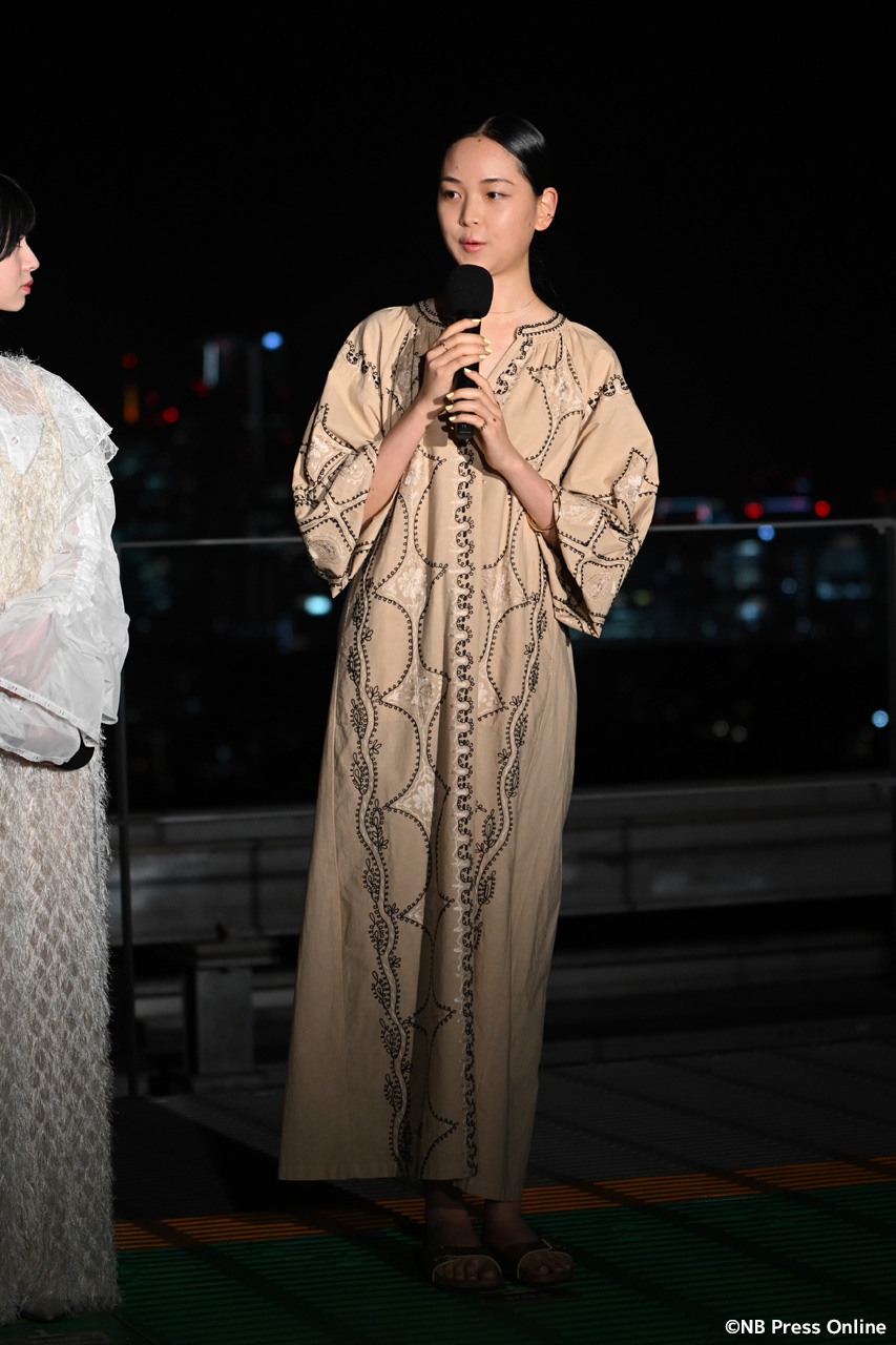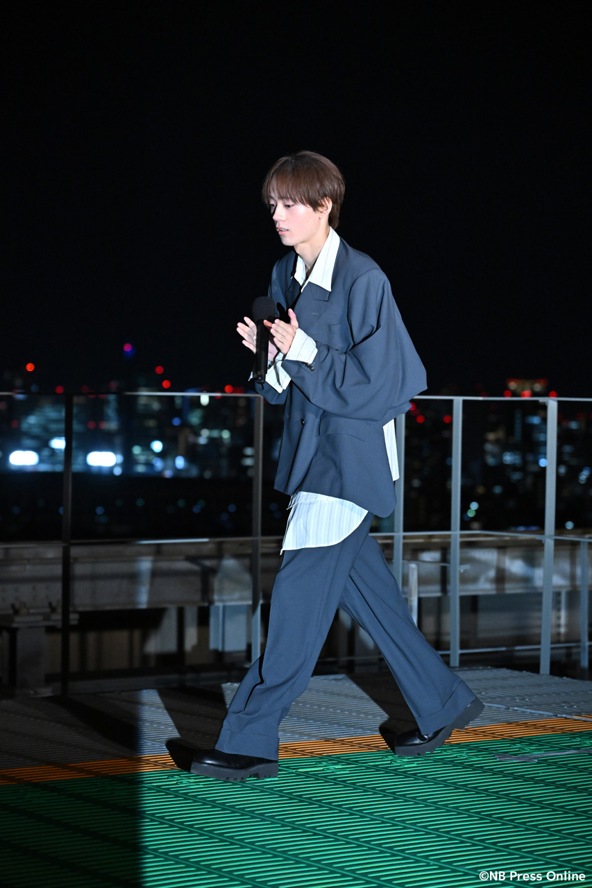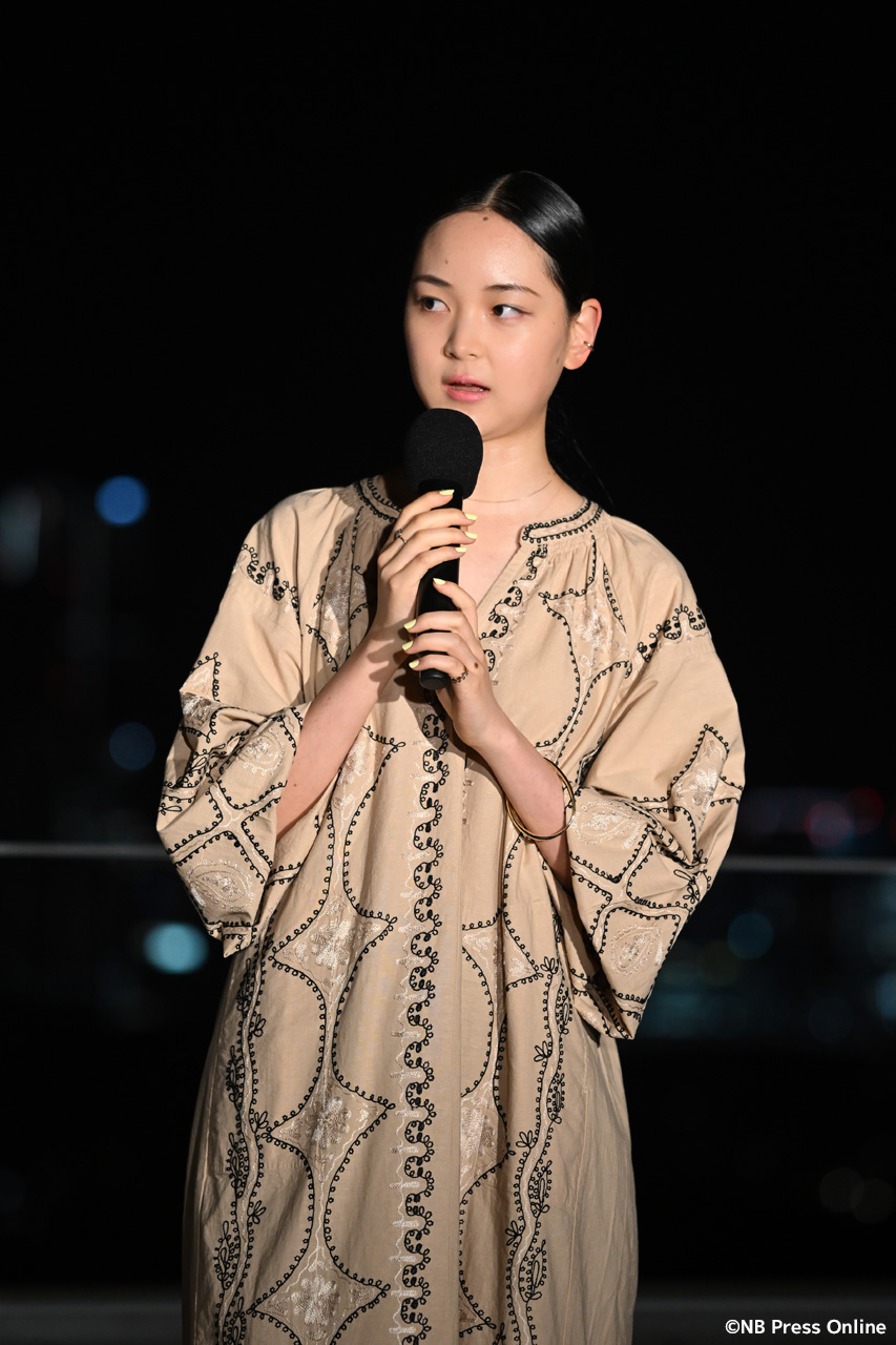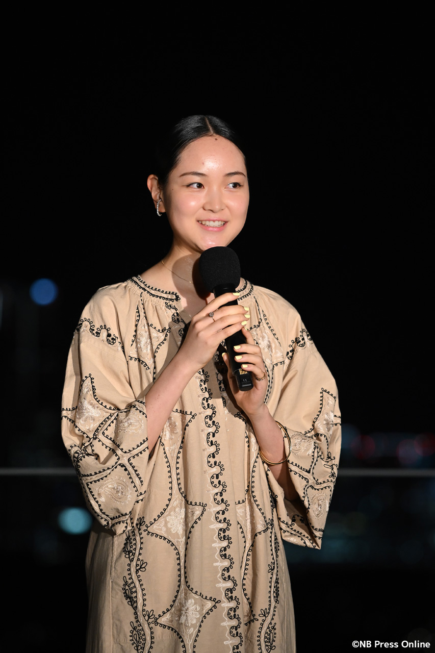 司会の三原氏から、早速会場である新宿バルト9の屋上、ヘリポートに立ってみての感想を求められると、桜田は、「ヘリポートに立ったことなんて人生初めてです」と語り、「多分初めての方も多いと思うんですけど、本当にすごくキラキラしていて、雨も降らずに本当に安心しました」と、イベントが無事開催できた安堵と会場への感動を述べた。