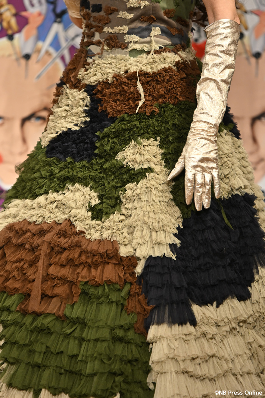 最後に登場した萬田久子は、長年にわたり第一線で活躍し、年齢や固定概念に囚われない自分らしい生き方を支持されている女優である。本日は帽子ではなく、羽のヘッドドレスを纏って登場した。衣装について「今日は帽子というか、これもドレスらしいんですよね」と述べ、カモフラージュアーミー柄がドレスになっていることにも感嘆。また、「シフォンの重なり。今日は美しさを重ねていきたい」と語った。