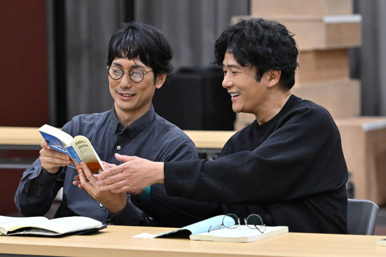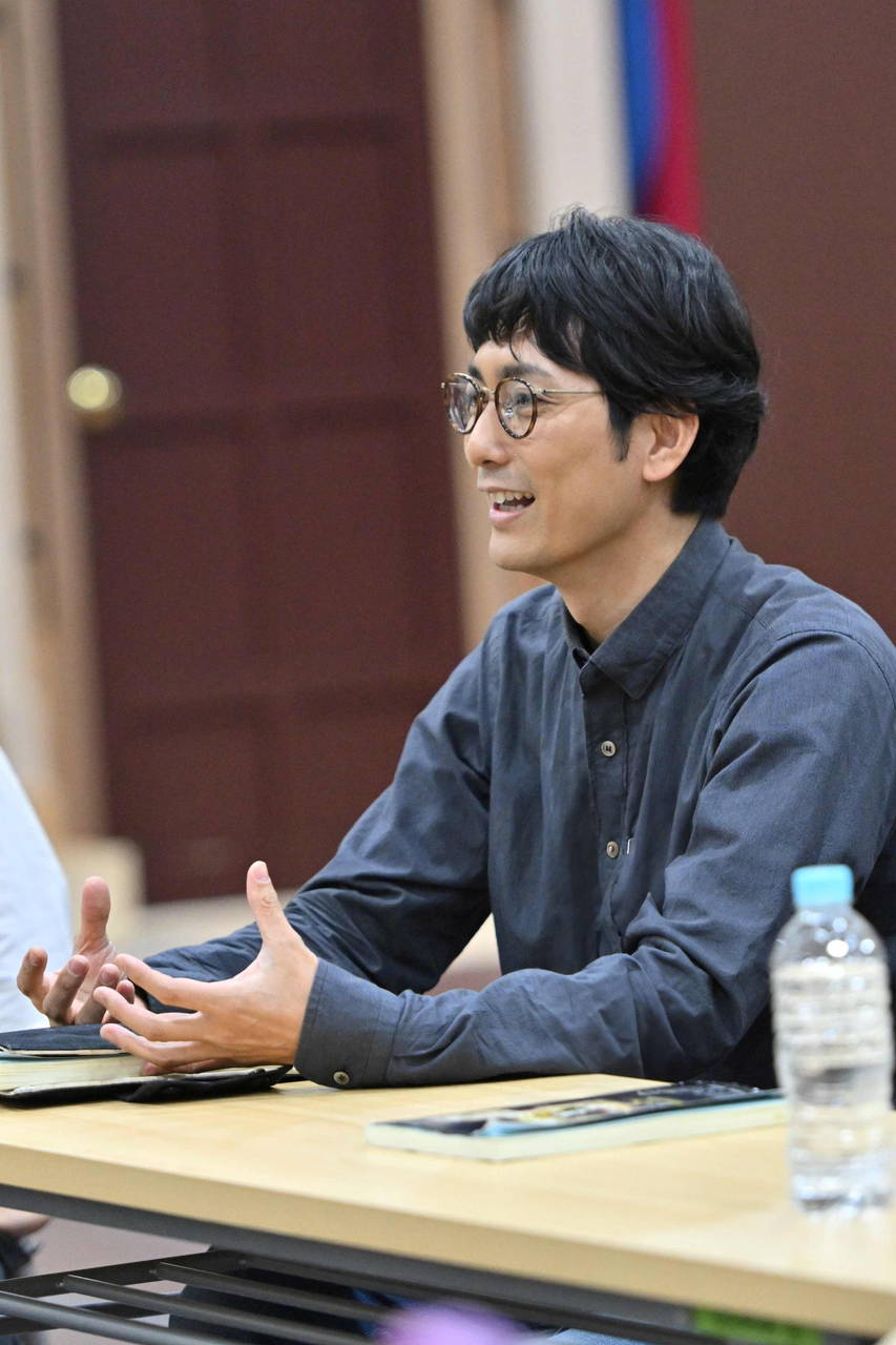 半円に並べられた席にキャストたちは座った。初めましての人たちも多く、誰もが少し緊張した面持ちだ。中央にはハリー・ポッター役の稲垣吾郎と平岡祐太が並んで座った。二人ともあの象徴的な黒縁メガネをかけているのが新鮮だ。