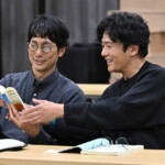 様々な年号が飛び交う中、エリックは2017年9月、ロンドンのキングスクロス駅で始まります」と正解を明かした。つまりロンドン初演時(2016年)はまだ未来の話だったわけだ。『ハリー・ポッターと死の秘宝』のラストが『呪いの子』の冒頭にあたるということで、エリックが「一人ずつ順番に『死の秘宝』の最終章を声に出して読んでください。どこまで読むかは自由です」とキャストの一人に本を手渡した。順番に少しずつ音読していく。平岡が2、3行読んで稲垣に本を渡すと、「もうちょっと読めば?」と稲垣が押し戻す場面も。徐々にキャストたちの緊張が解け、和やかになっているのがよくわかる。