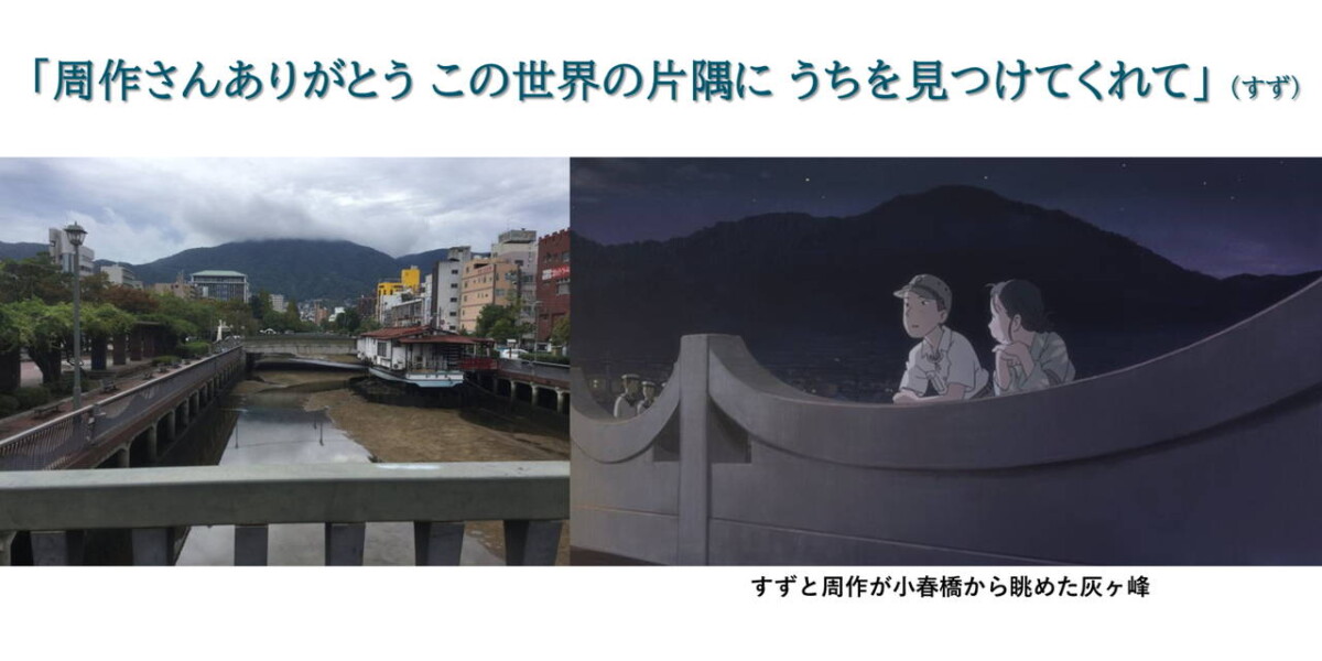 呉の小春橋は、すずと周作がデートした夜に語り合いそっと心を通わせた特別な場所。時を経て橋は新しくなったが、その名は変わらず残り、訪れる人は今もなお、二人が歩いた情景にそっと思いを重ねて、灰ヶ峰の美しい姿を眺めることができる。