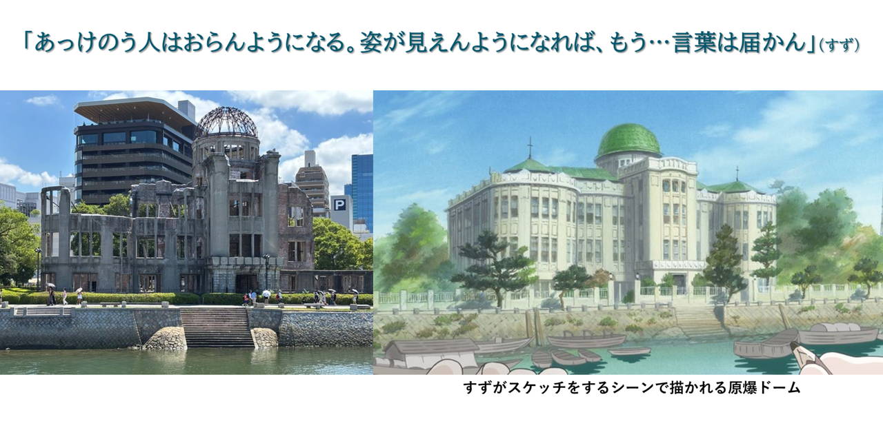 映画の中で、すずがスケッチをするシーンがありますが、その中の1シーンで旧広島産業奨励館、現原爆ドームを描いている。1996年に世界文化遺産に登録され、平和を願う象徴的な建物として大切に保存されている。