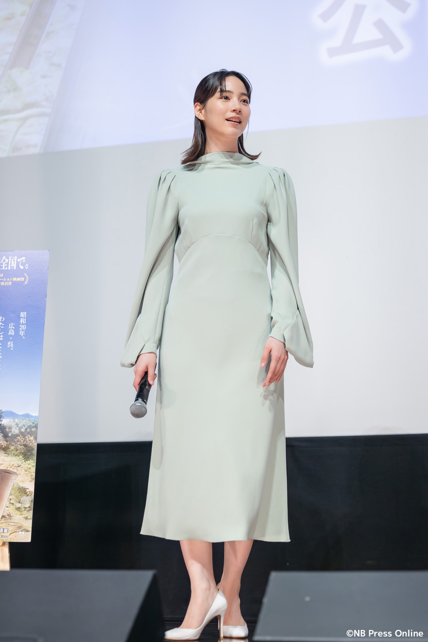 舞台挨拶の終盤では、MCがのんに「すずさん」として9年後の生活を問う演出があった。