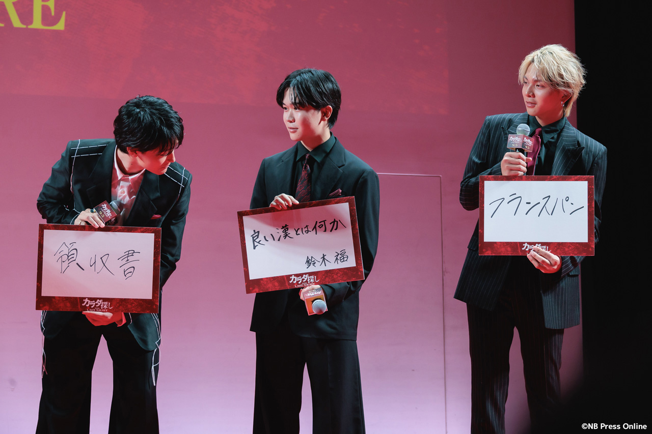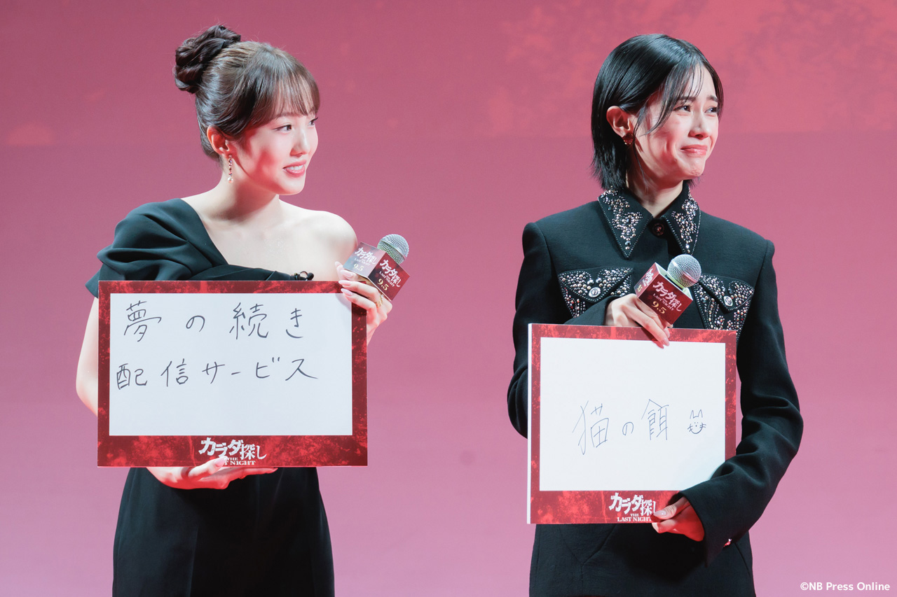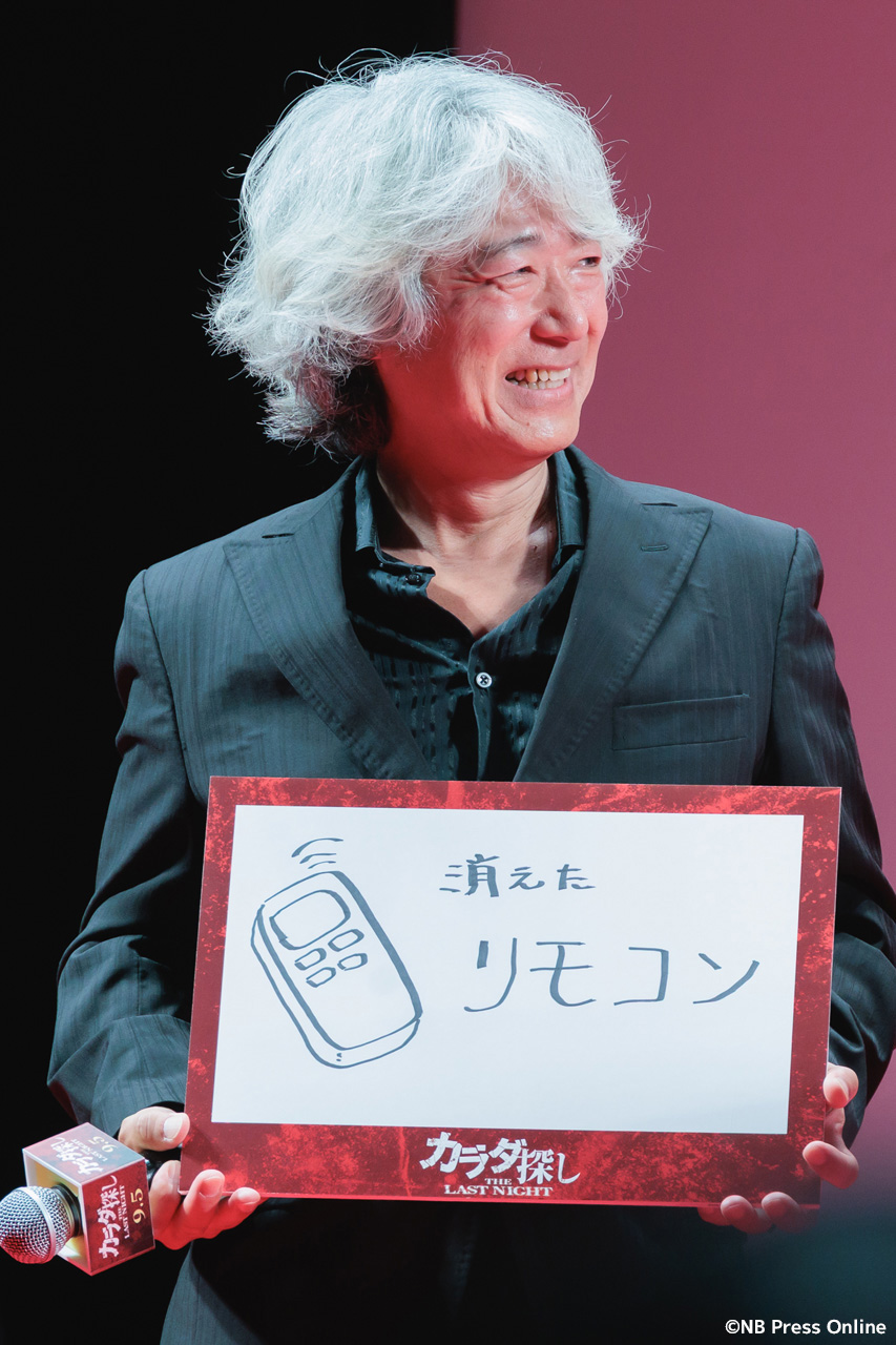 多くの貴重なエピソードで盛り上がる中、続いてのコーナーでは劇中の“赤い人”のセリフ「私のカラダ探して…」にちなみ、「いま“探して”いるもの」、もしくは「最近まで“探して”いて、ついに見つけたもの」をそれぞれフリップに書いて発表。