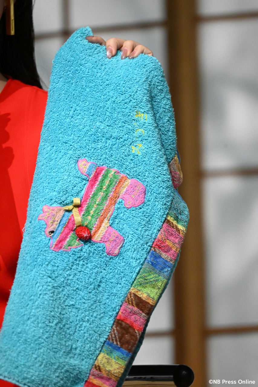 山下は、水色のタオルを披露した。タオルには「みづき」と刺繍されており、幼少期にお母さんが刺繍を入れてくれた唯一手元に残っている思い出の品だと説明した。