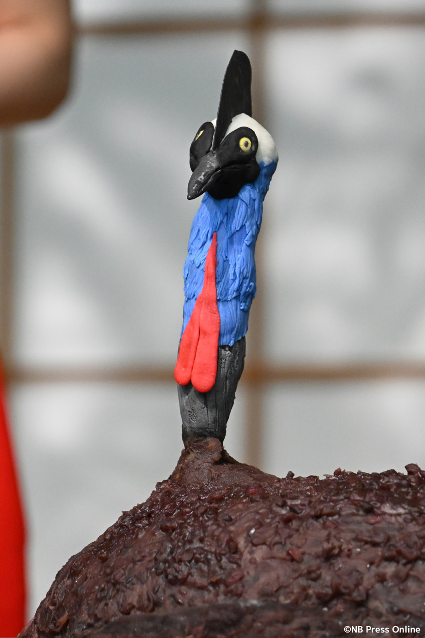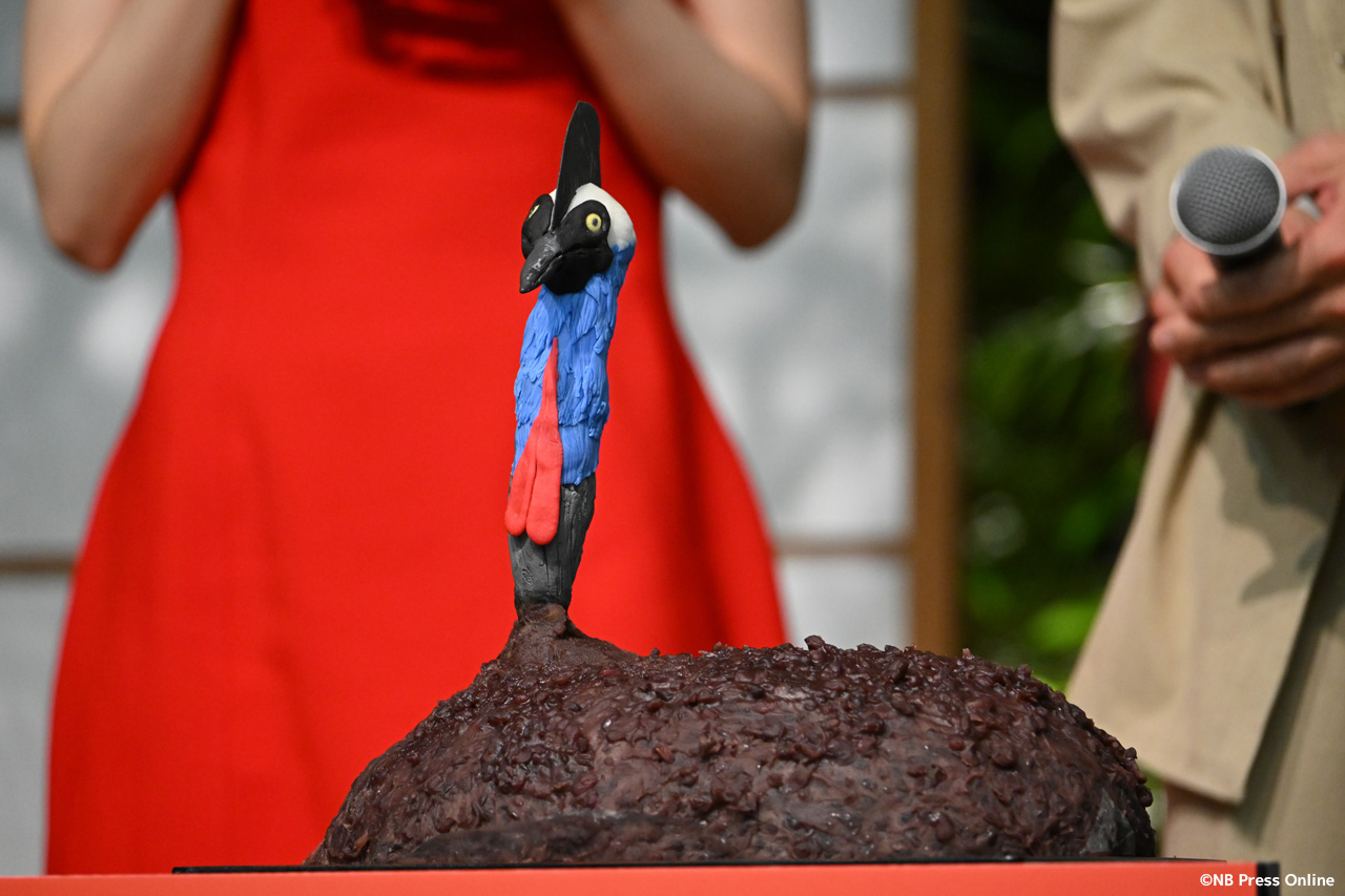 イベント実施日の9月23日が「秋分の日」であることにちなみ、ご先祖を敬いおはぎを食べる日本の文化に合わせて、大ヒット祈願として「火喰鳥を模したおはぎ」がステージに運び込まれた。