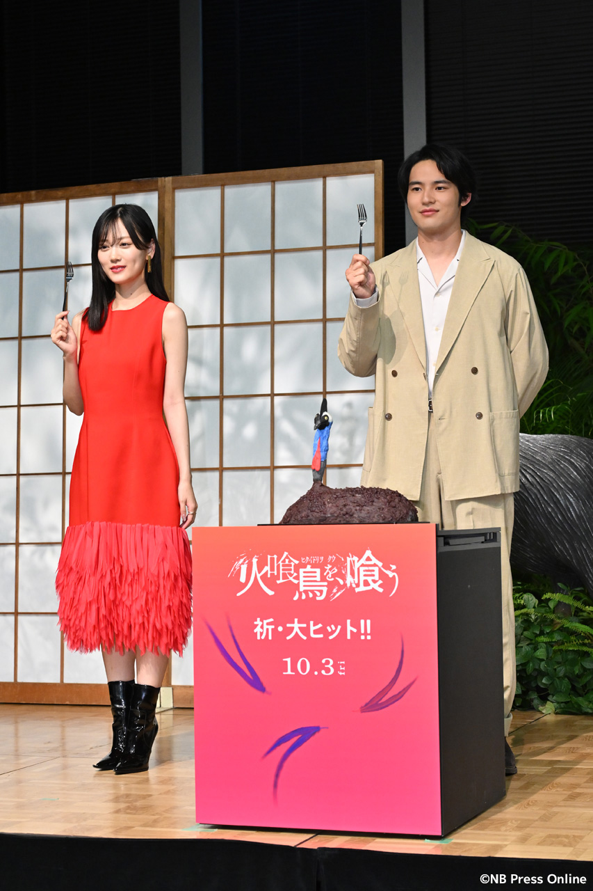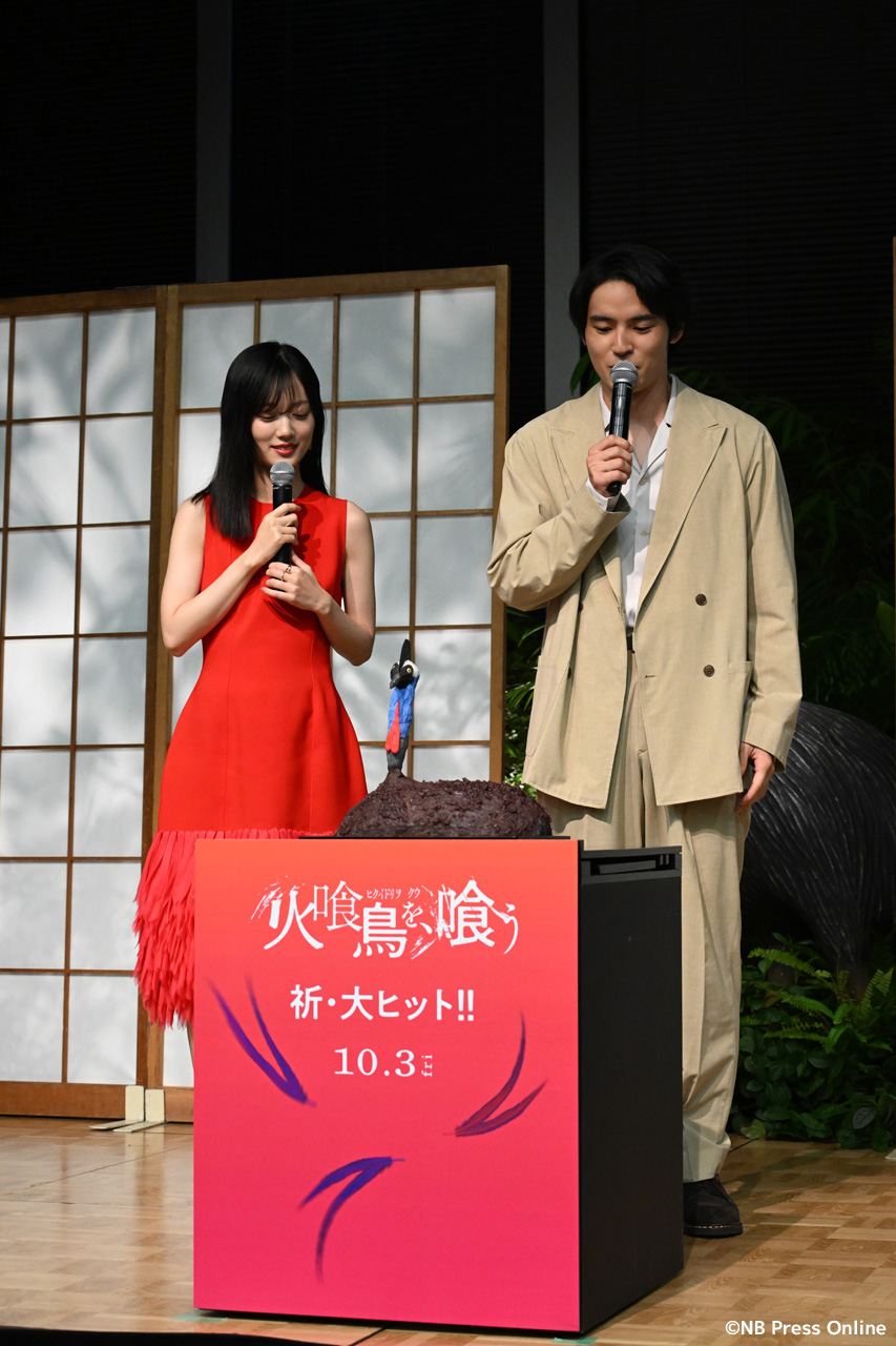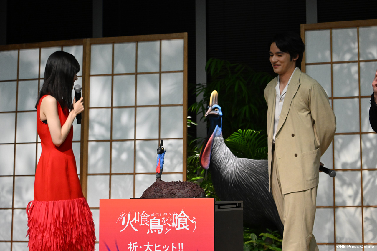 ステージには、映画のモチーフである「火喰鳥」を模した巨大なマスコットが設置されており、宮舘が「当たり前のように低い鳥がいるんですけども」と触れると、MCから「これ100万円するらしいですよ」という驚きの情報が明かされた。