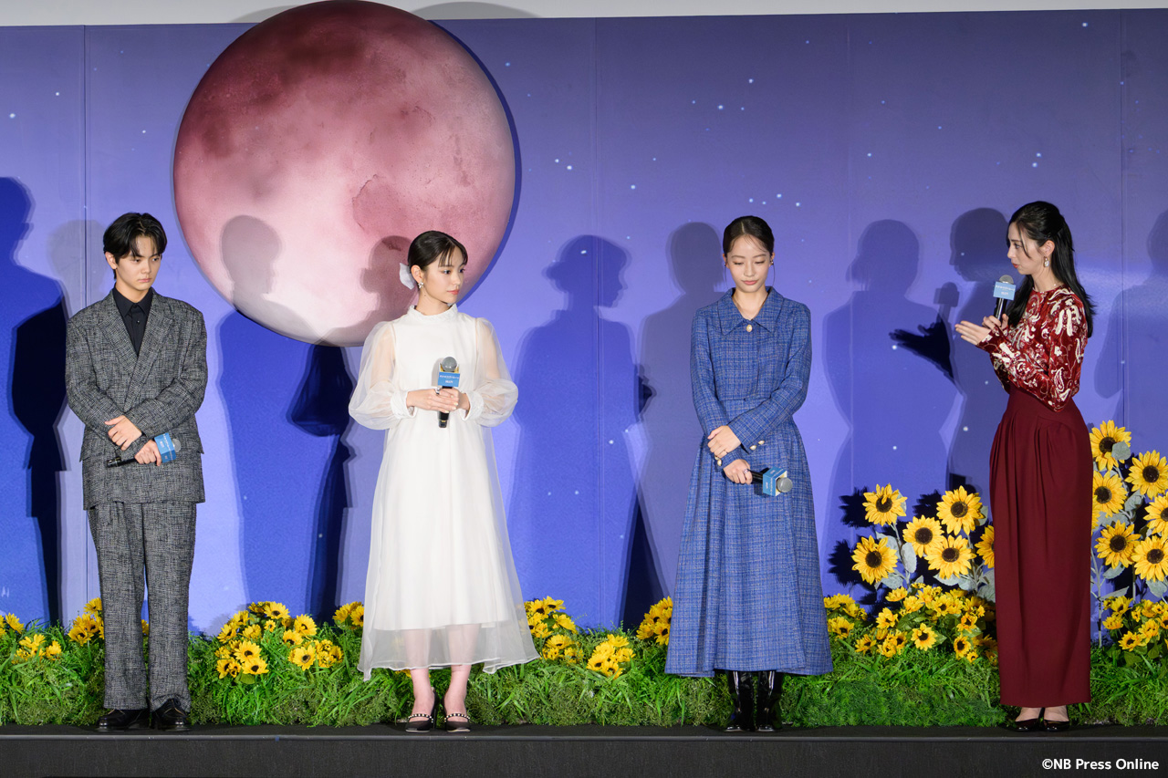 桜井萌を演じた當真あみは、作品を観客に見ていただき、直接会うのが初めてであることに触れ、「こうして作品を皆さんに見ていただく、そして直接お会いするっていうのが今日が初めてなのでとてもとても楽しみにしてきました。この時間が皆さんにとって本当に楽しいと思える時間になるよう今日務めてまいるのでよろしくお願いいたします」と述べた。