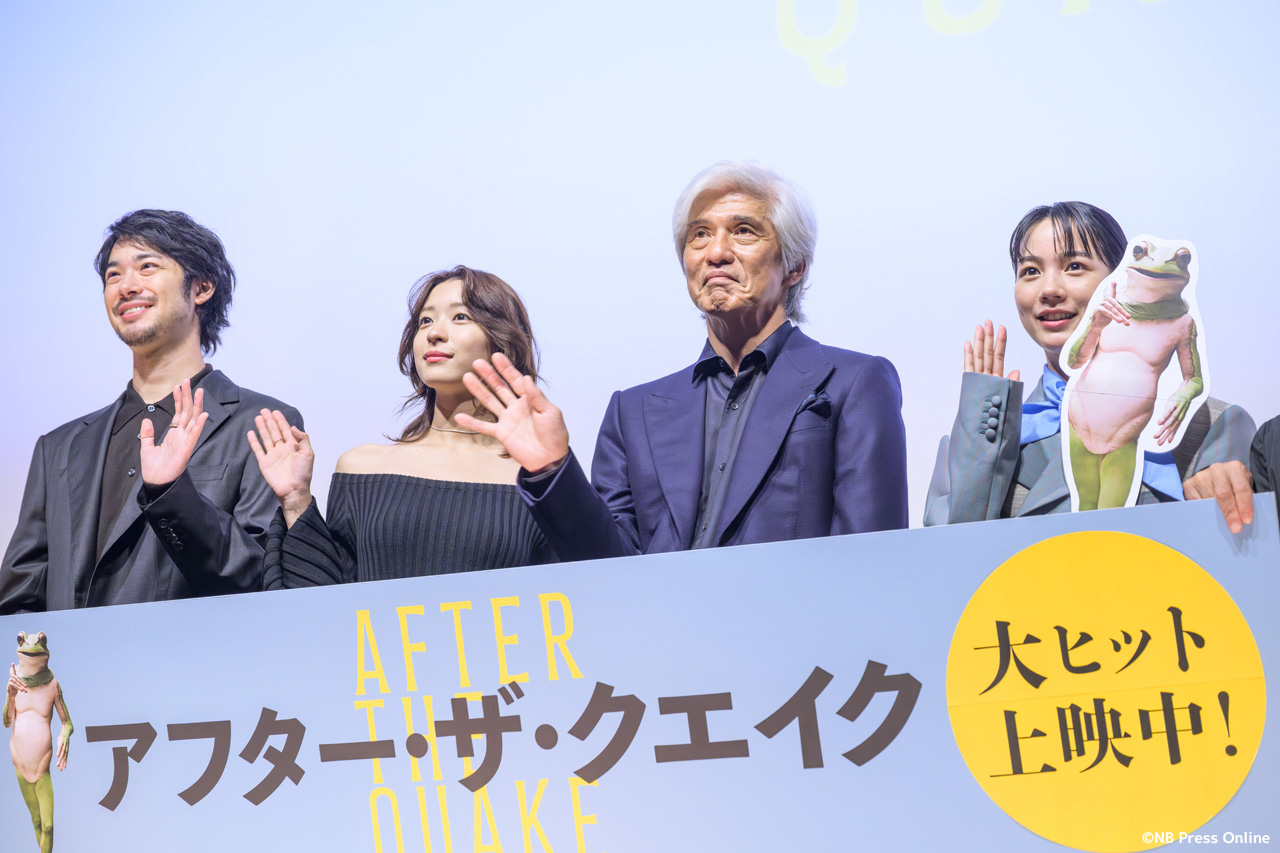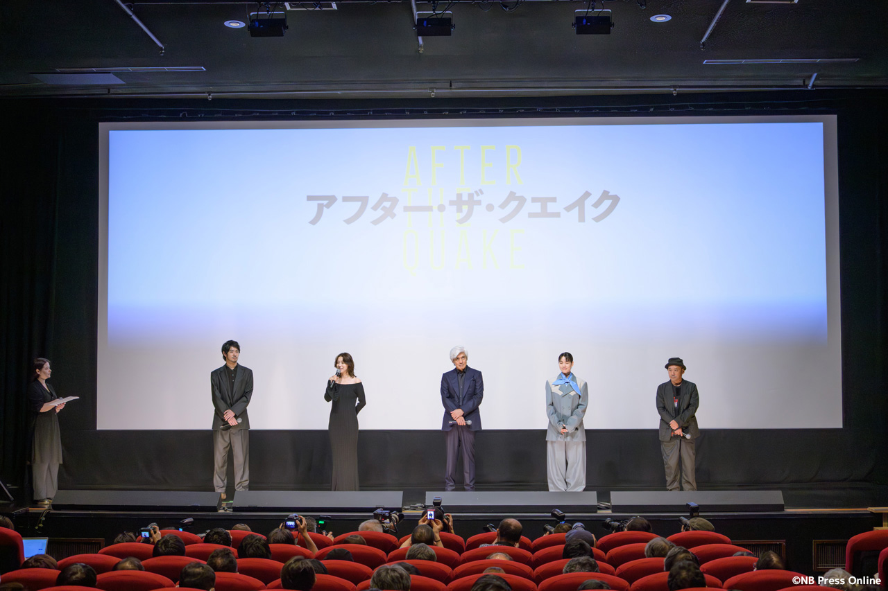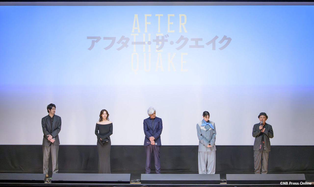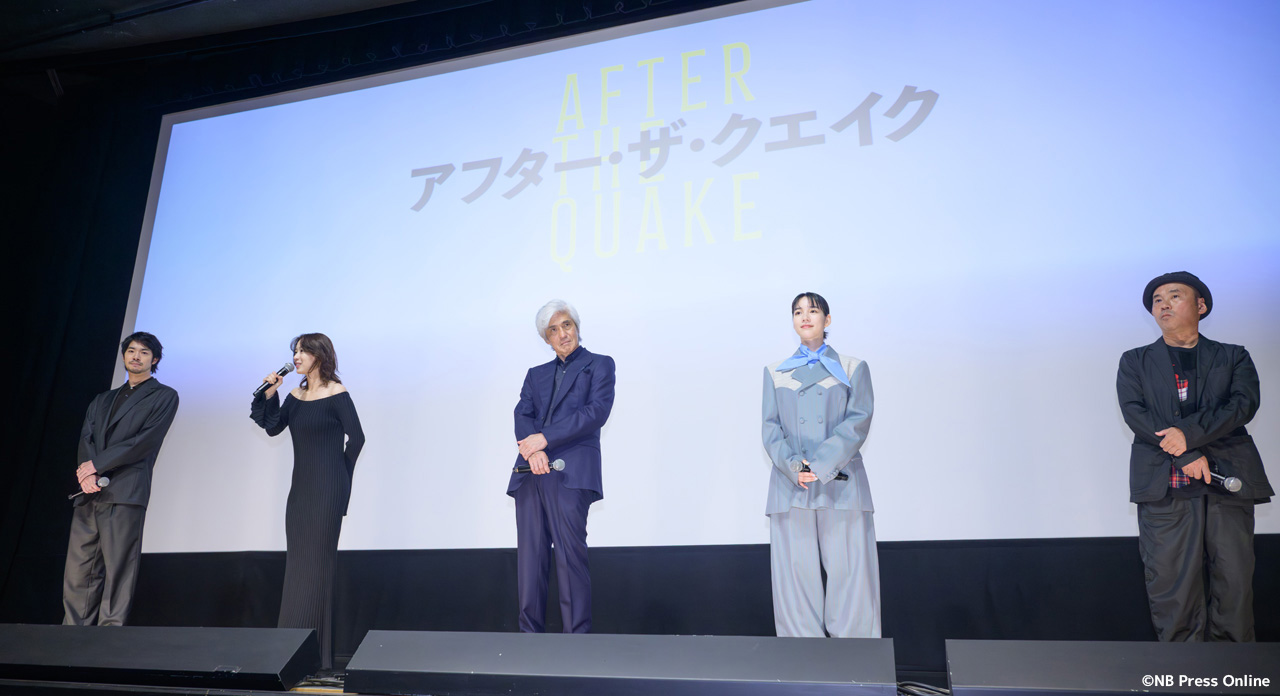 2025年10月4日、テアトル新宿にて、映画『アフター・ザ・クエイク』公開記念舞台挨拶が行われ、鳴海唯、渡辺大知、佐藤浩市、のん、井上剛監督が登壇。また、岡田将生からのビデオメッセージも紹介された。