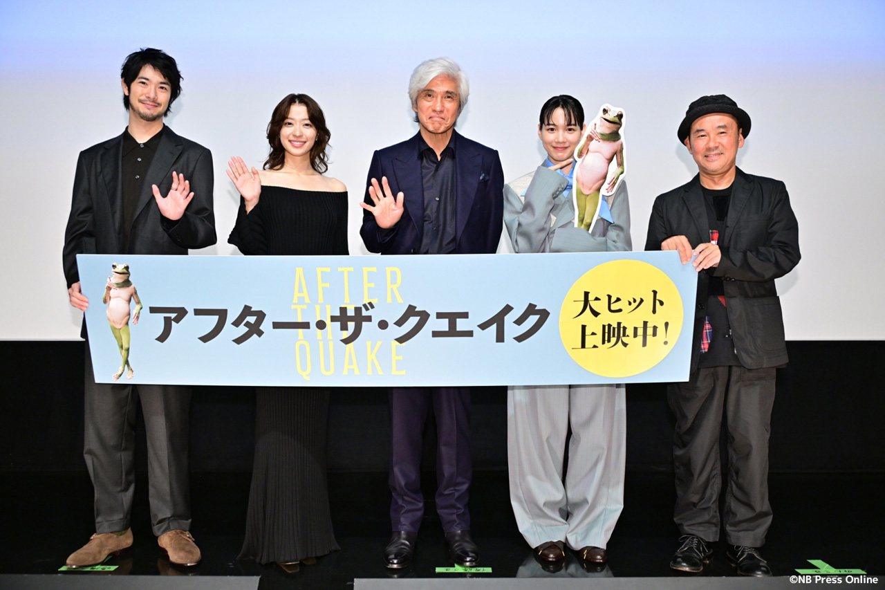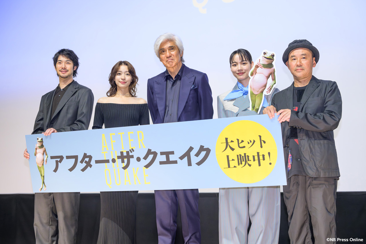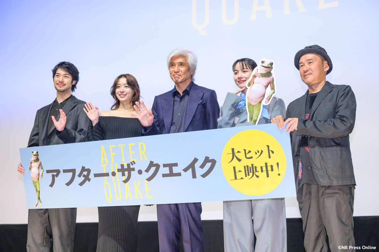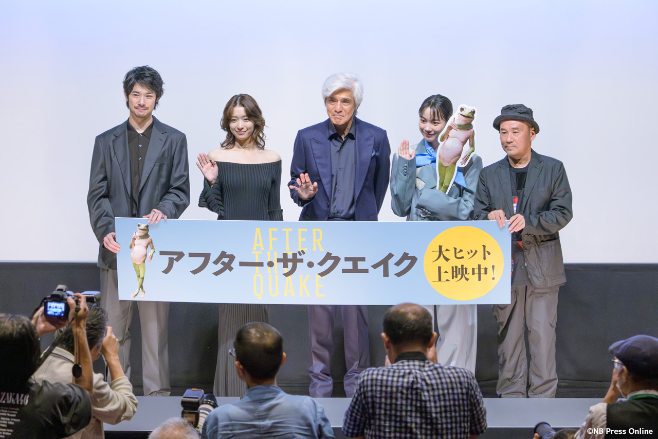 2025年10月4日、テアトル新宿にて、映画『アフター・ザ・クエイク』公開記念舞台挨拶が行われ、鳴海唯、渡辺大知、佐藤浩市、のん、井上剛監督が登壇。また、岡田将生からのビデオメッセージも紹介された。