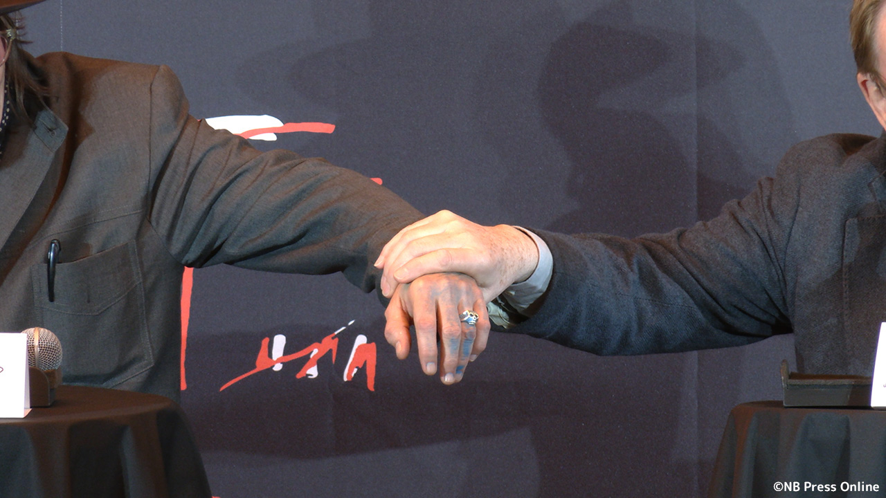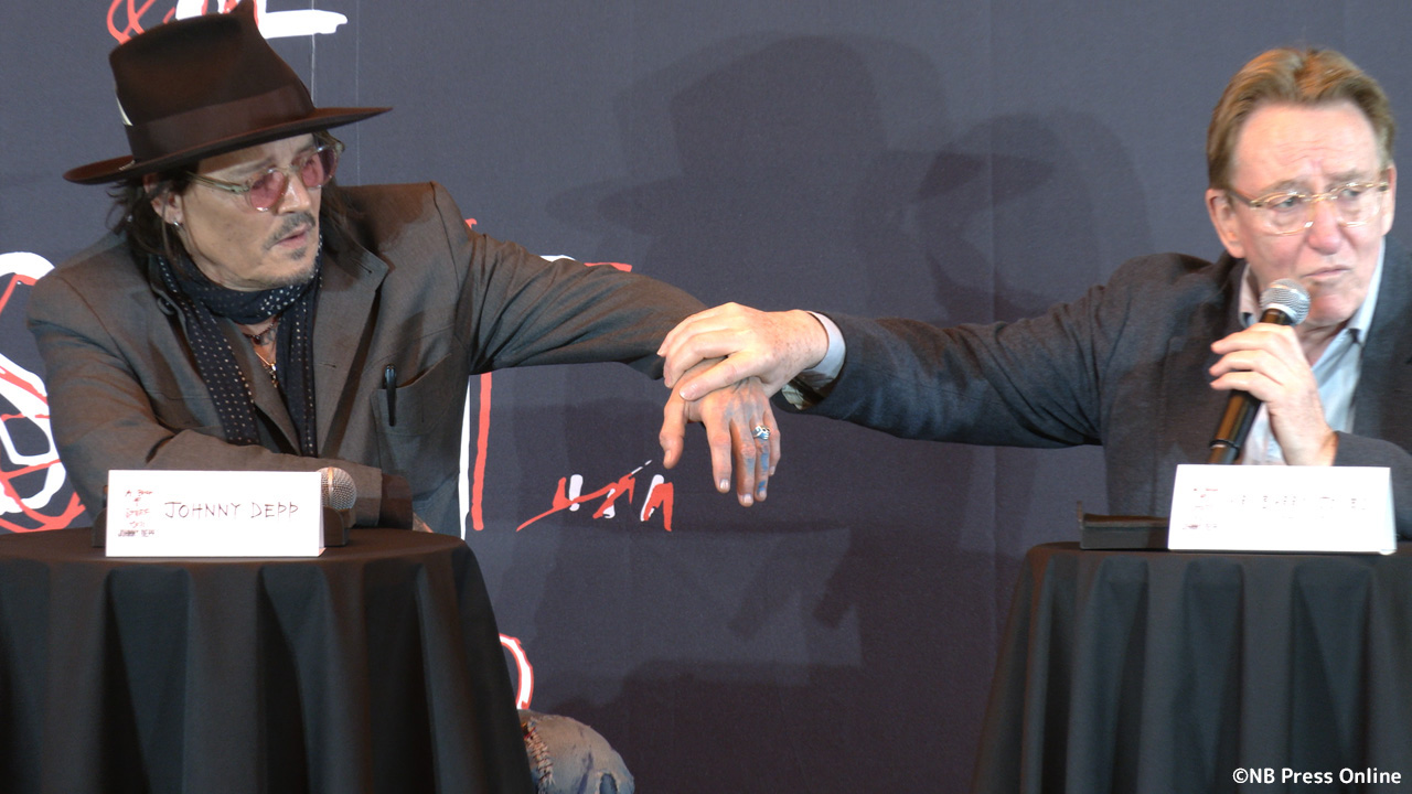 そして、彼がいかにアートにコミットしているかを示すために、皆さんに証明したいと思います。(ジョニー・デップの手を取り)皆さん、見てください、彼は今日、手に青いペンキをつけたまま記者会見に来ています。なぜなら、彼は日本滞在中のホテルの部屋で、つい先ほどまでキャンバスに絵を描いていたからです。これが彼のコミットメントの証です。