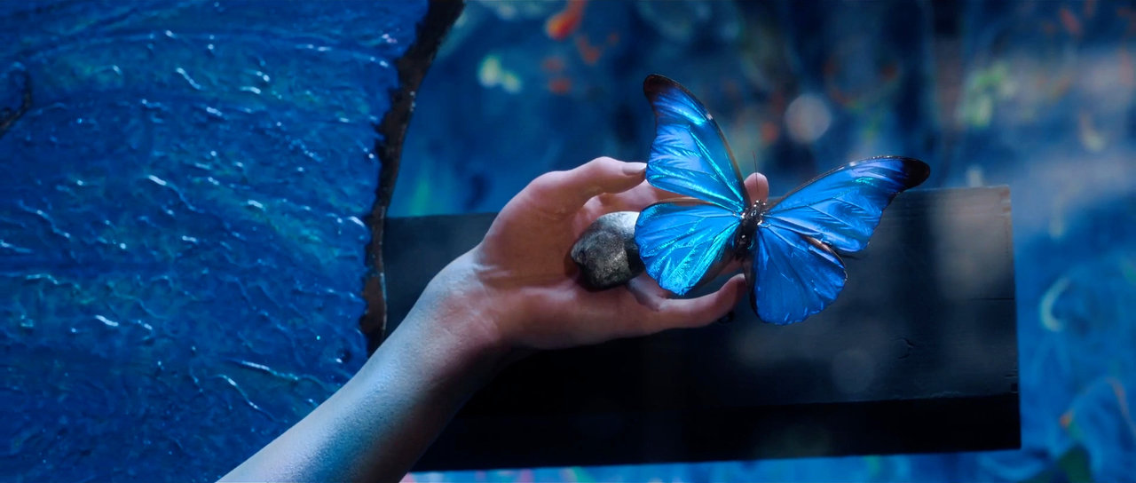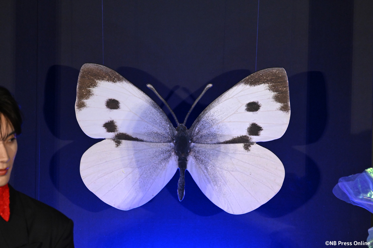 ステージには、作中に登場する蝶を収めた巨大な“標本”が立ち並び幻想的な空気が漂う中、突如姿を現したレーザー投影された一匹の美しい蝶。