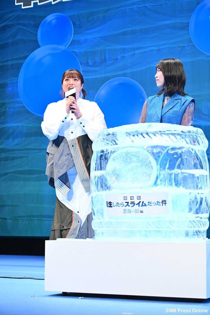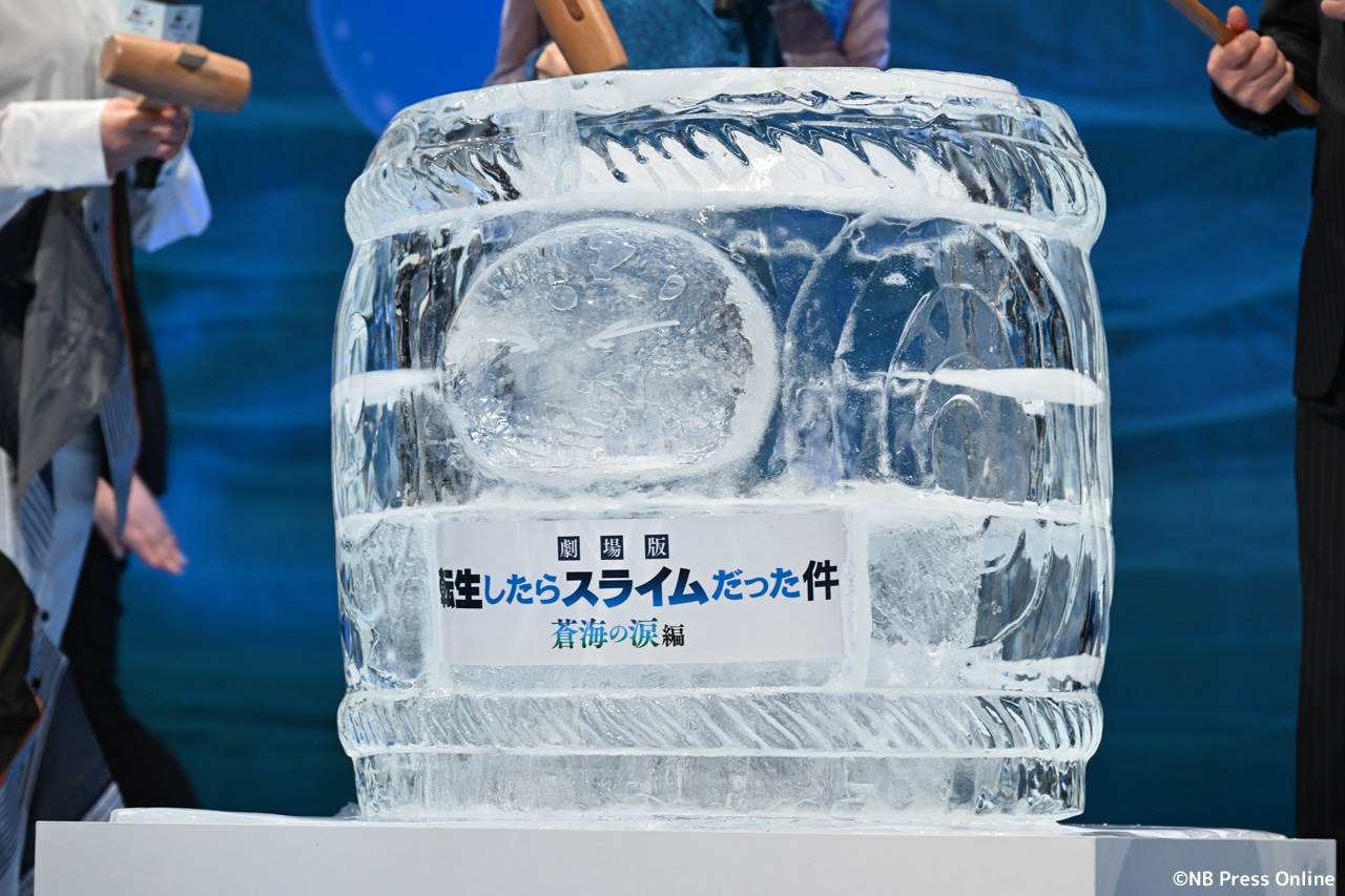 岡咲の「『転スラ 蒼海の涙編』完成!」の掛け声に続いて、観客と登壇者全員が「おめでとう!」と応え、登壇者が木づちで見事に氷の樽を割ると、青いライトがきらびやかに点灯し、舞台上での壮大な演出に、会場全体が湧きあがった。