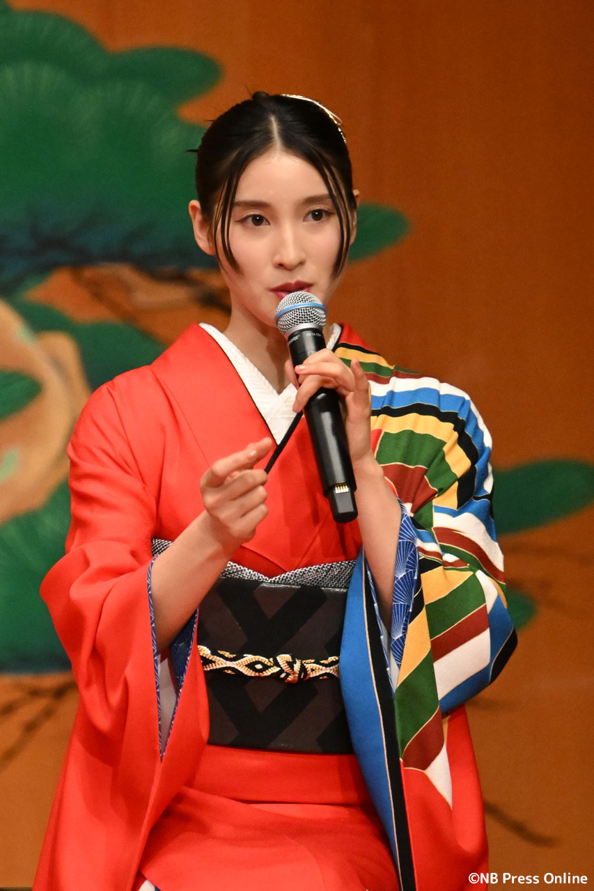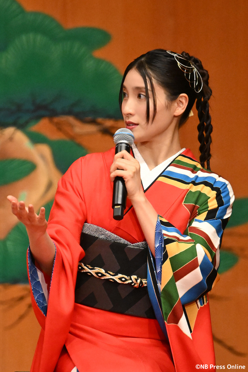 時代を超えた先で 出会う神秘的なキャラクター・卑弥呼を務めた土屋太鳳は「生まれて初めてゲームの世界で役を生 きることが出来ました」と声を弾ませて「卑弥呼は時空を超えてキャラクターが変わる人物なので、そんな意味を込めて選んだ御着物です」と笑顔を見せた。