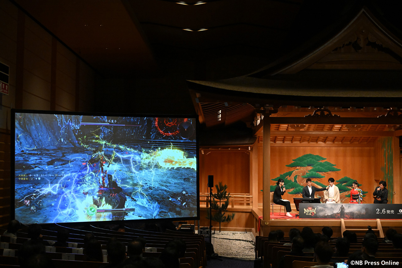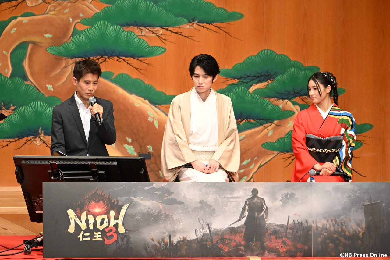 発表会には、『仁王』シリーズ初代プロデューサーを務めた当社代表取締役社長の鯉沼久史をはじめ、安田文彦ゼネラルプロデューサー、柴田剛平プロデューサーが登壇し、本作に関する最新情報ならびに開発秘話をご紹介。また、『仁王3』に出演する俳優の土屋太鳳と本郷奏多がキャラクターのイメージに合わせた華やかな和装で登場し、役作りの裏側やアフレコ時のエピソードなどを語った。