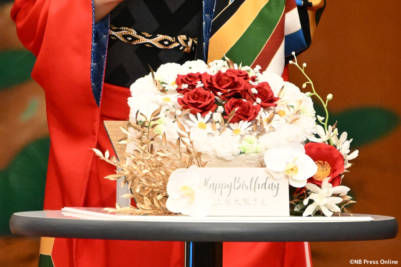 イベントのラストは、2月3日に誕生日を迎える土屋にサプライズ祝福を発動!『仁王3』チームを代表して本郷から花束と和紙で制作したバスデーケーキがプレゼントされた。