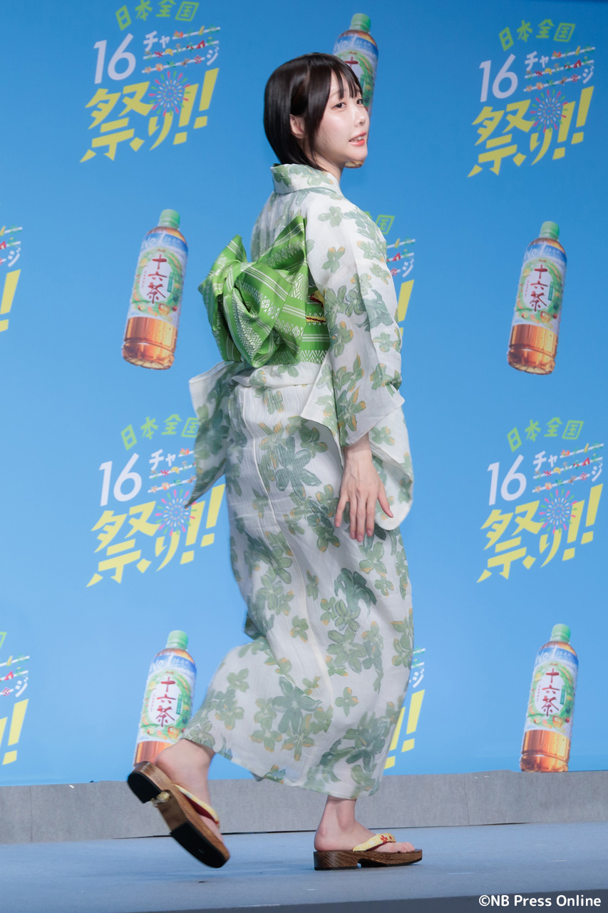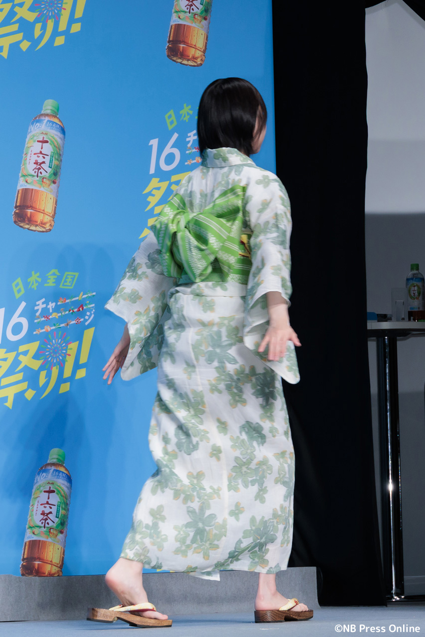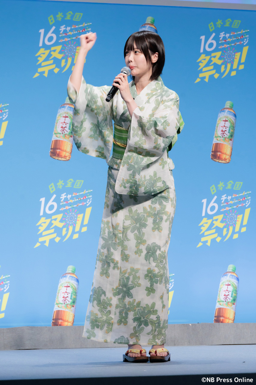 MCのユージの呼び込みで、華やかな「十六茶」カラーの浴衣姿のあのが登場した。
