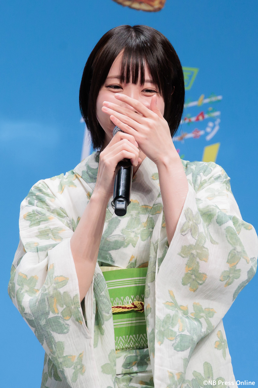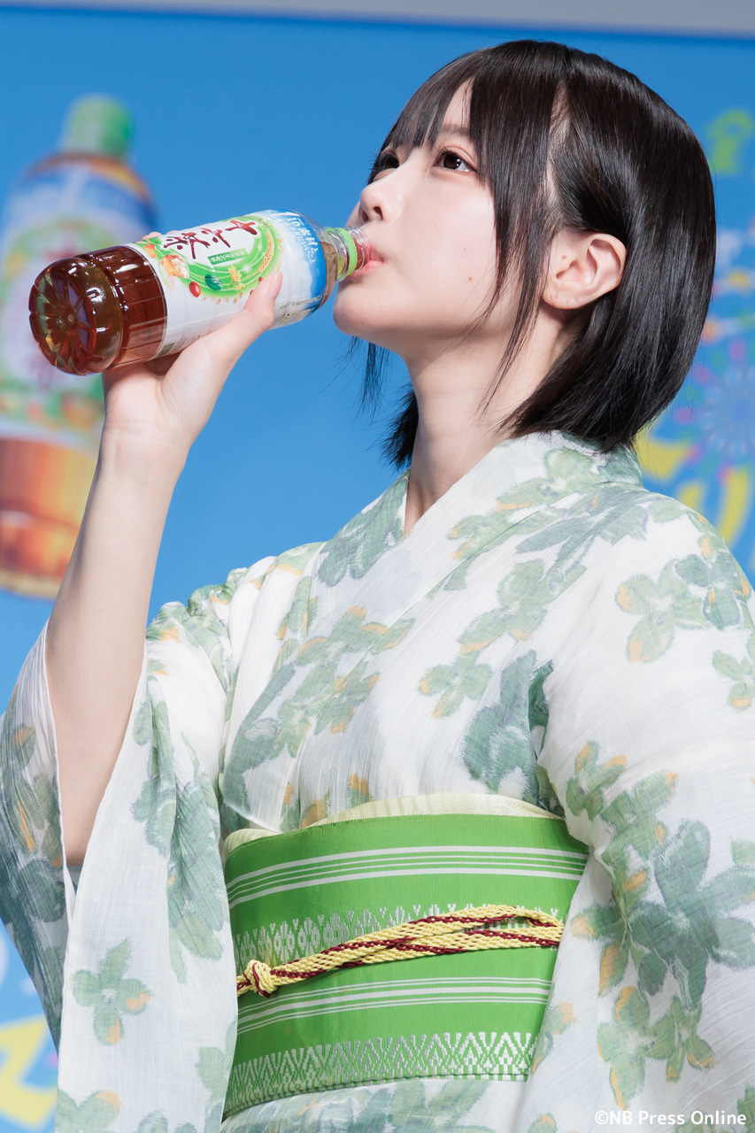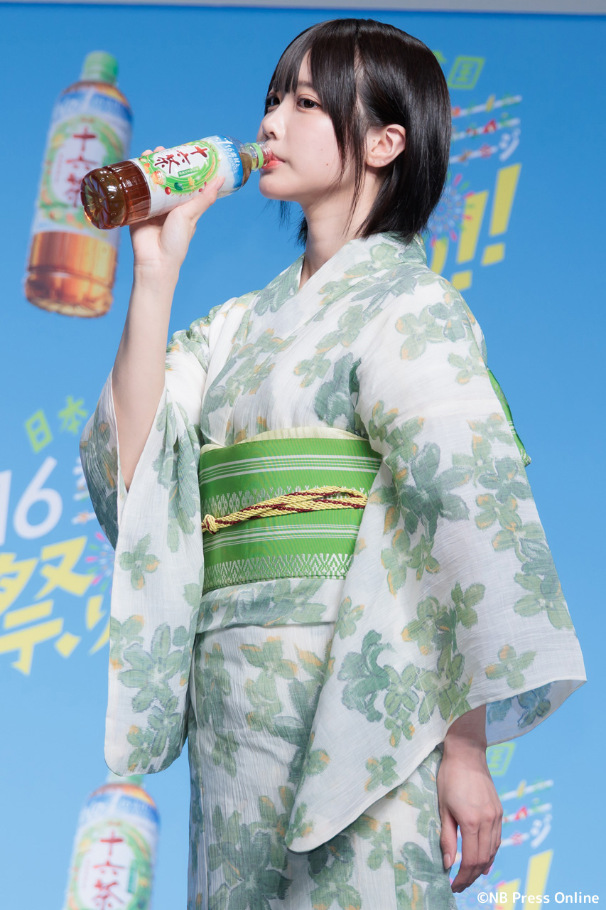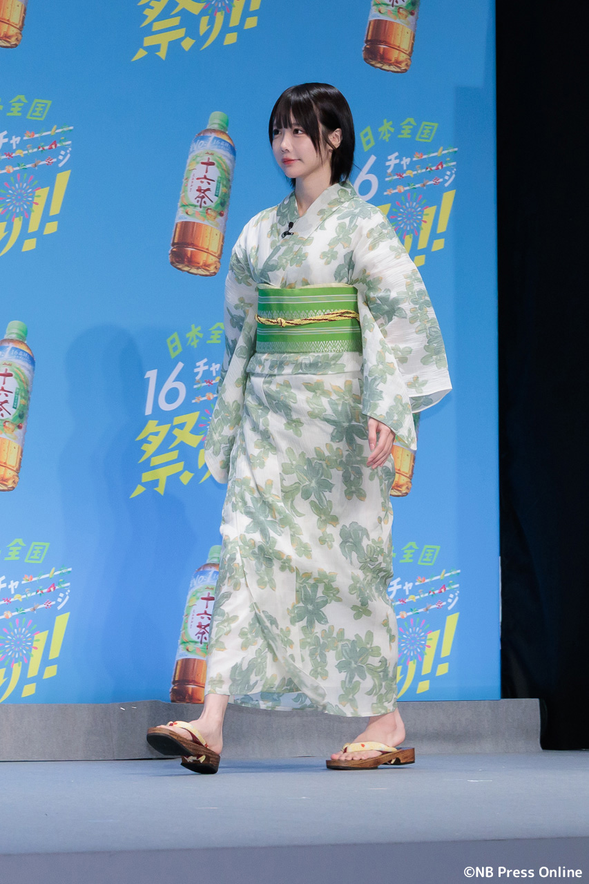 MCのユージの呼び込みで、華やかな「十六茶」カラーの浴衣姿のあのが登場した。