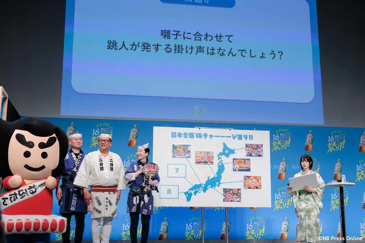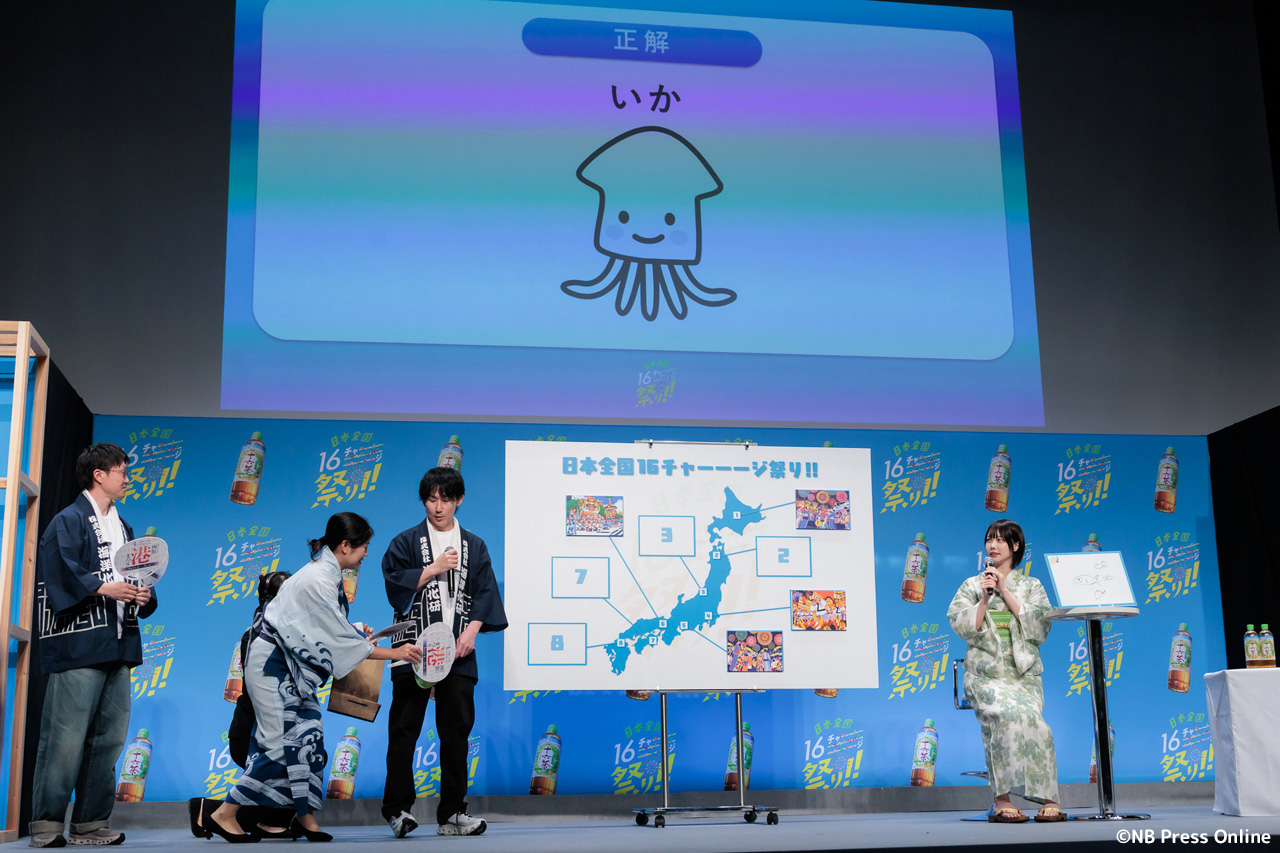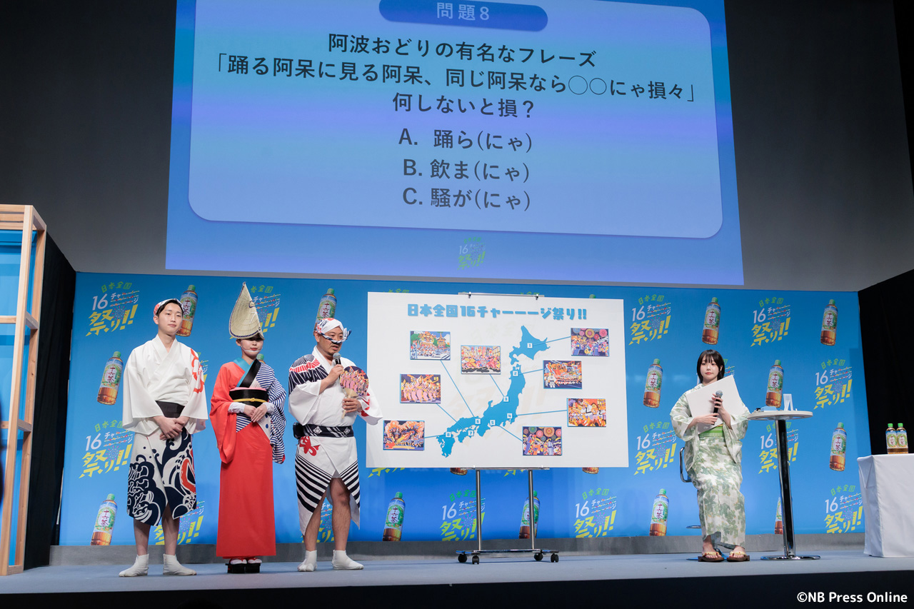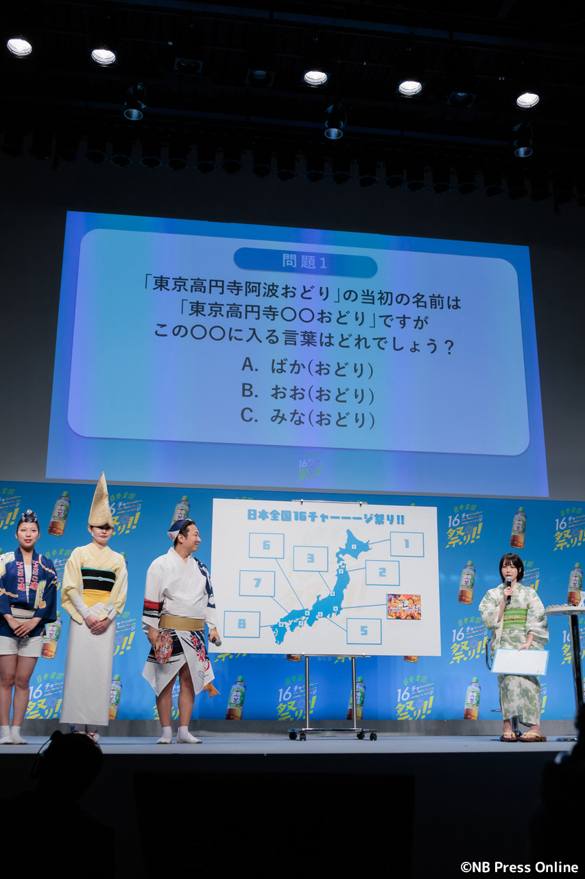 続いて、全国各地のお祭り代表者が登壇し、あのさんがクイズに挑戦する企画が行われた。1問正解ごとに十六茶2本と、各お祭りのプレミアムなグッズが贈られるというルール。