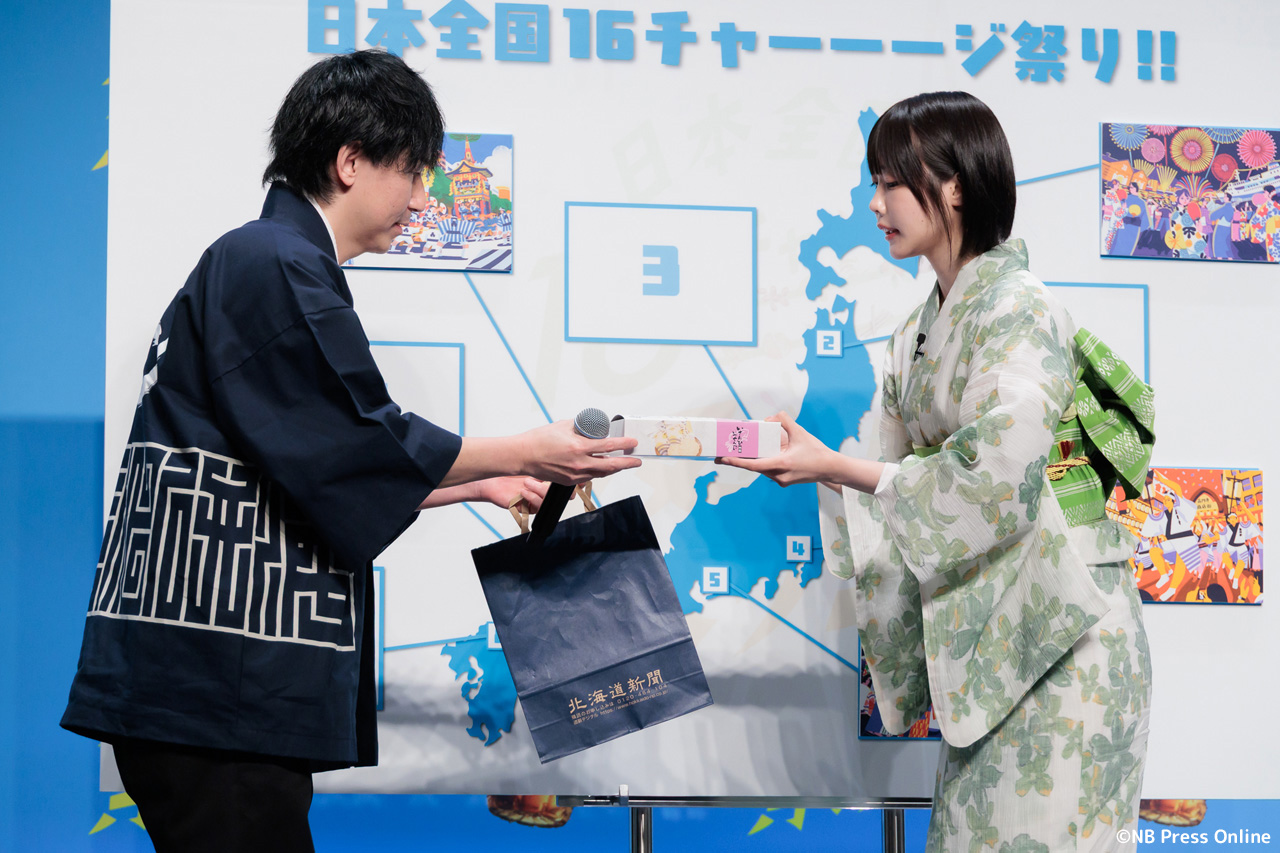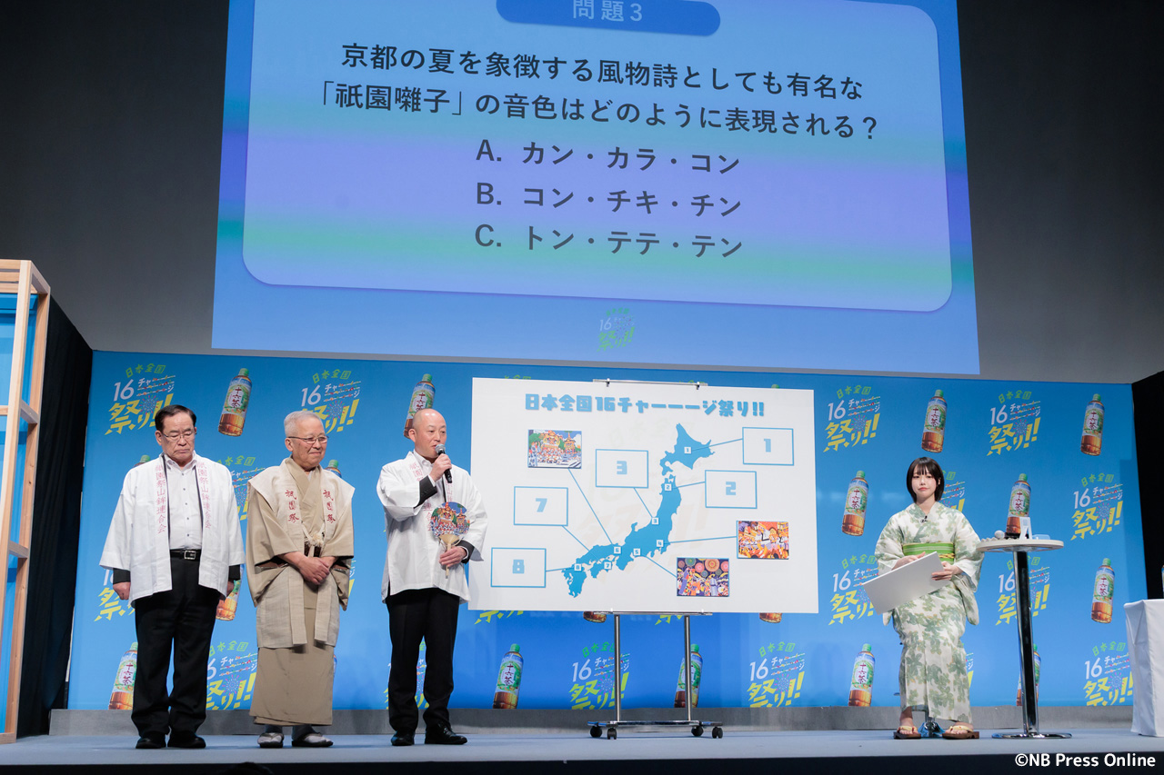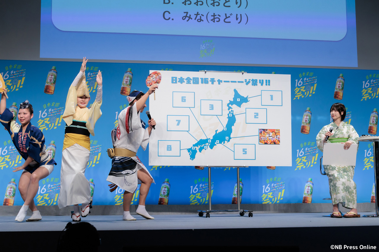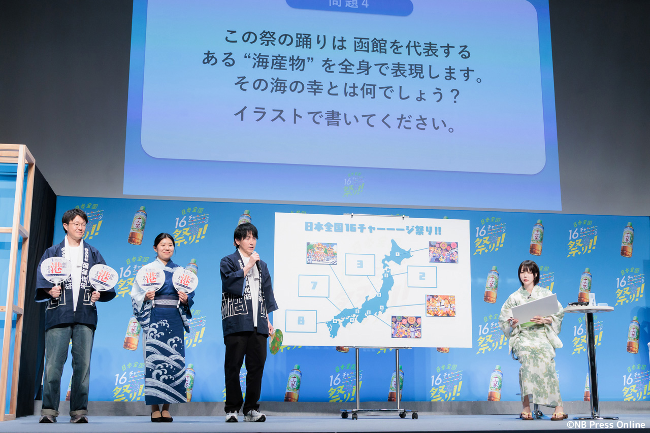 続いて、全国各地のお祭り代表者が登壇し、あのさんがクイズに挑戦する企画が行われた。1問正解ごとに十六茶2本と、各お祭りのプレミアムなグッズが贈られるというルール。